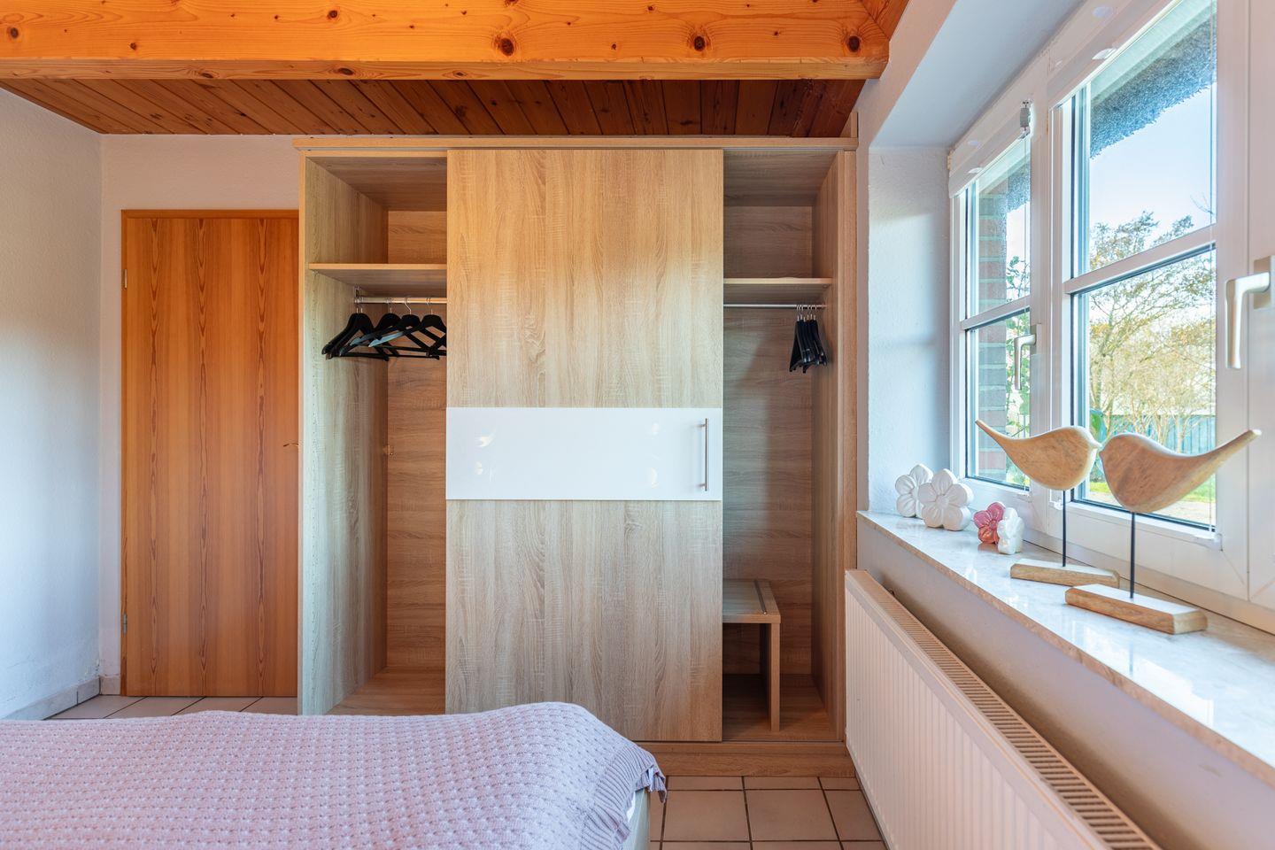 Ein bequemes Doppelbett (180x200) erwartet Sie im ersten Schlafzimmer. Ein großzügiger Kleiderschrank bietet hier ausreichend Stauraum und Ablagefläche.