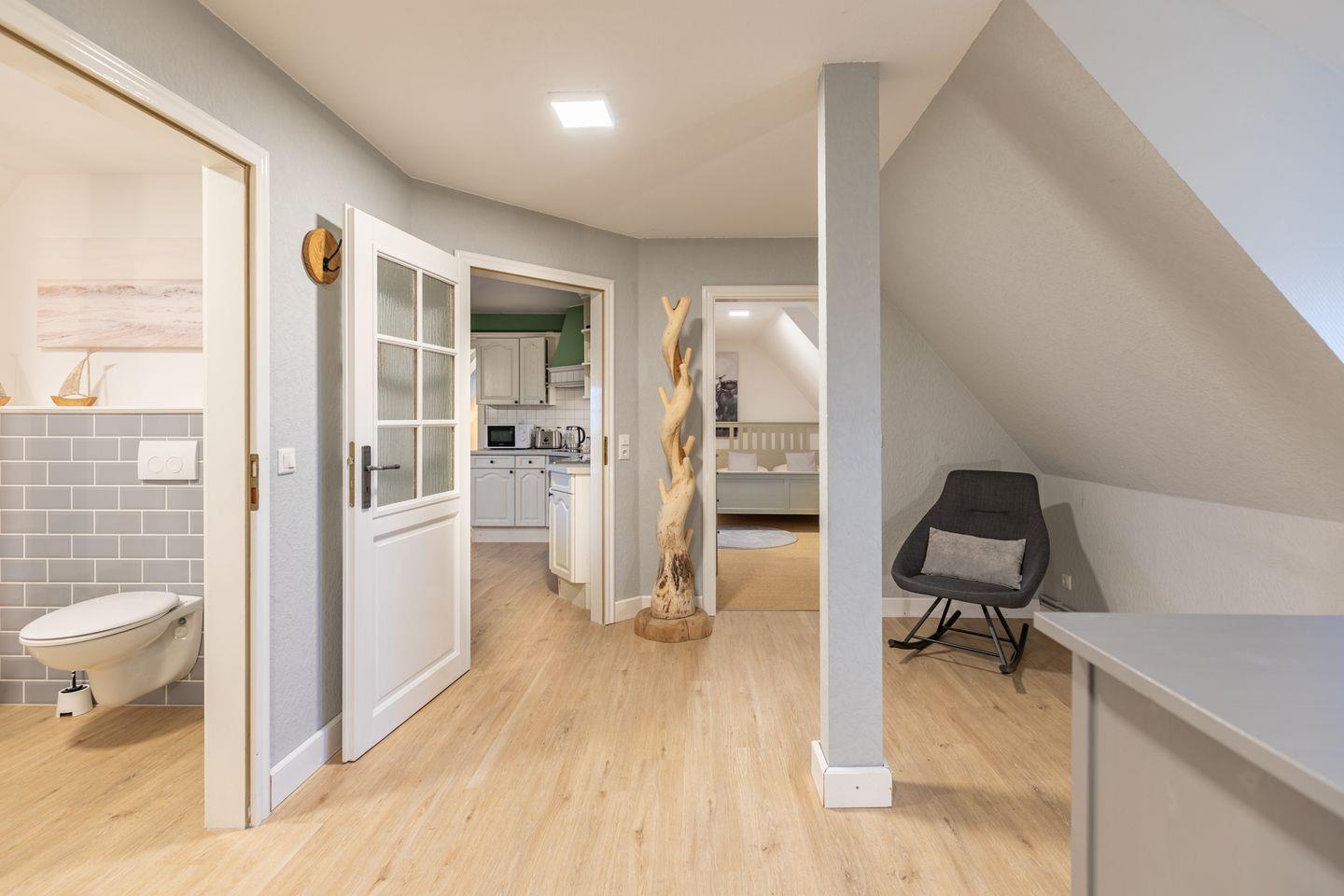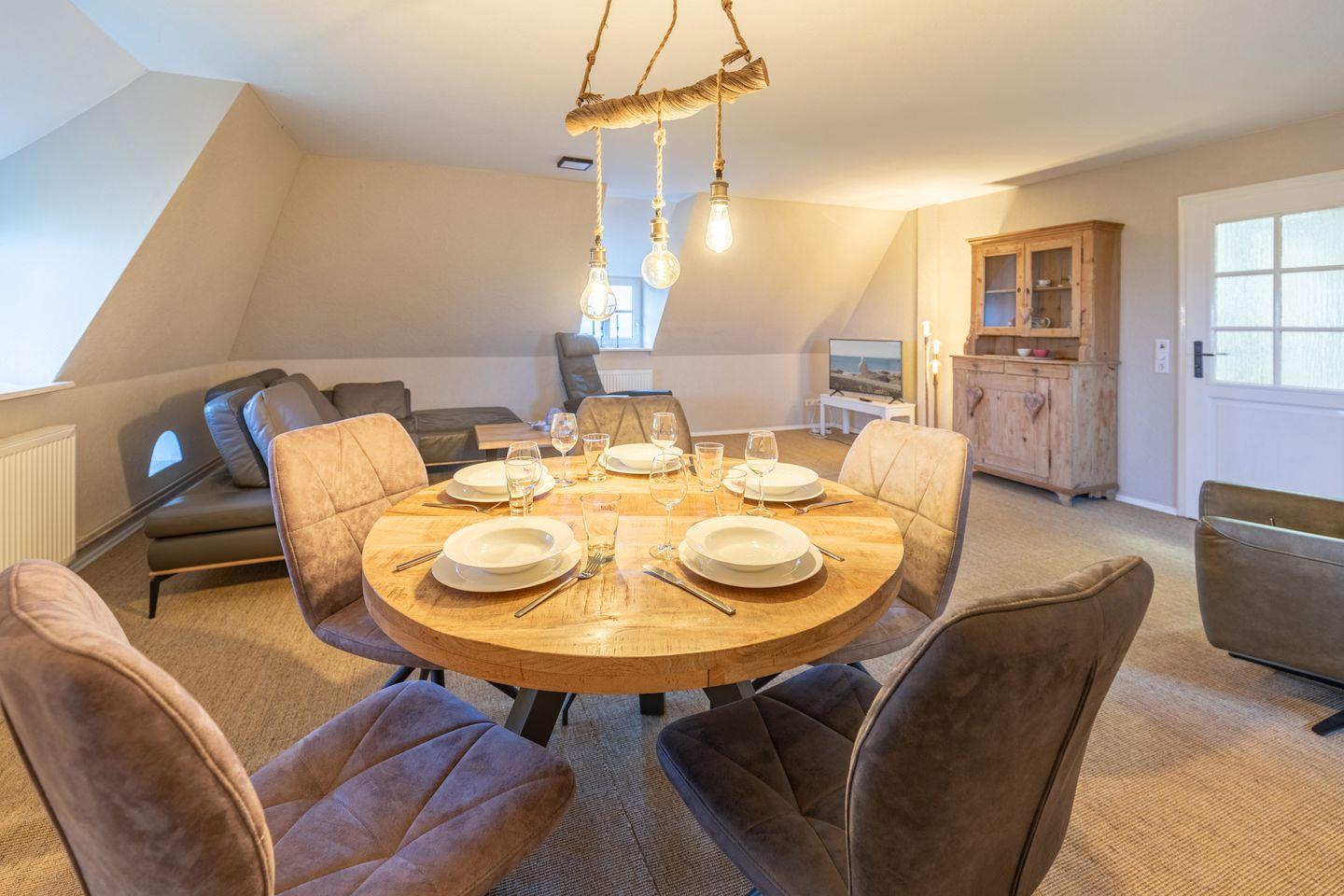 Die 90 Quadratmeter große Wohnung im 1. OG eignet sich mit ihren vier Zimmern hervorragend für Familien oder geeignet! Der gemütliche Wohnbereich mit Sofaecke und Essbereich lädt zu geselligen Stunden ein. Ein Fernseher, Bücher, Spiele und ein Radio sorgen für Unterhaltungsmöglichkeiten.