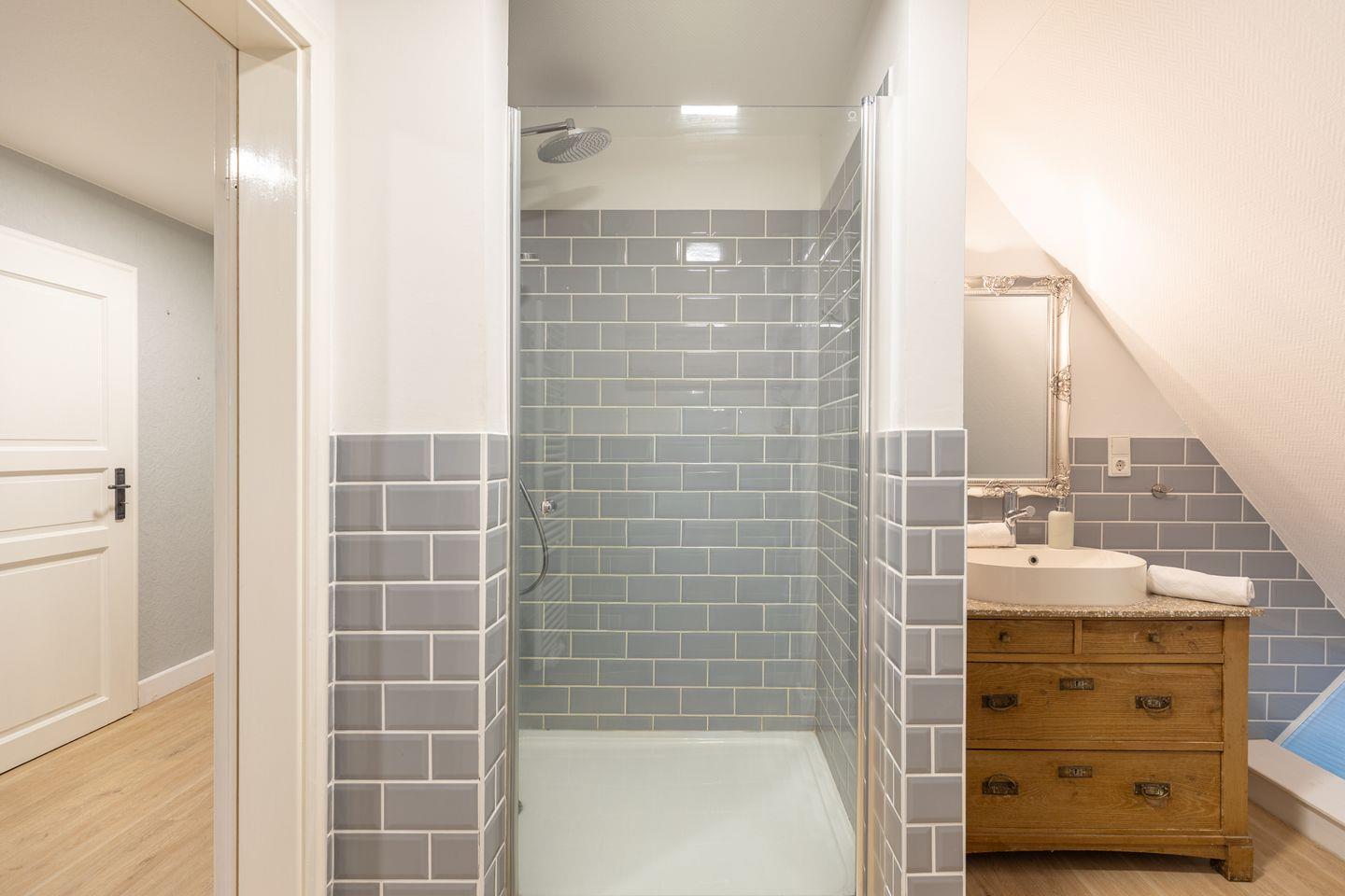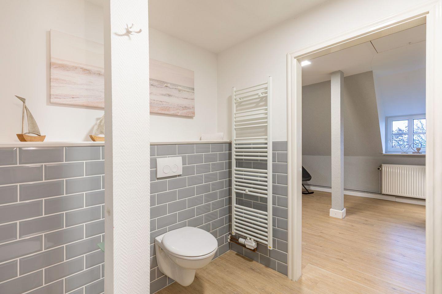 Das helle Badezimmer verfügt über eine Dusche sowie ein WC.