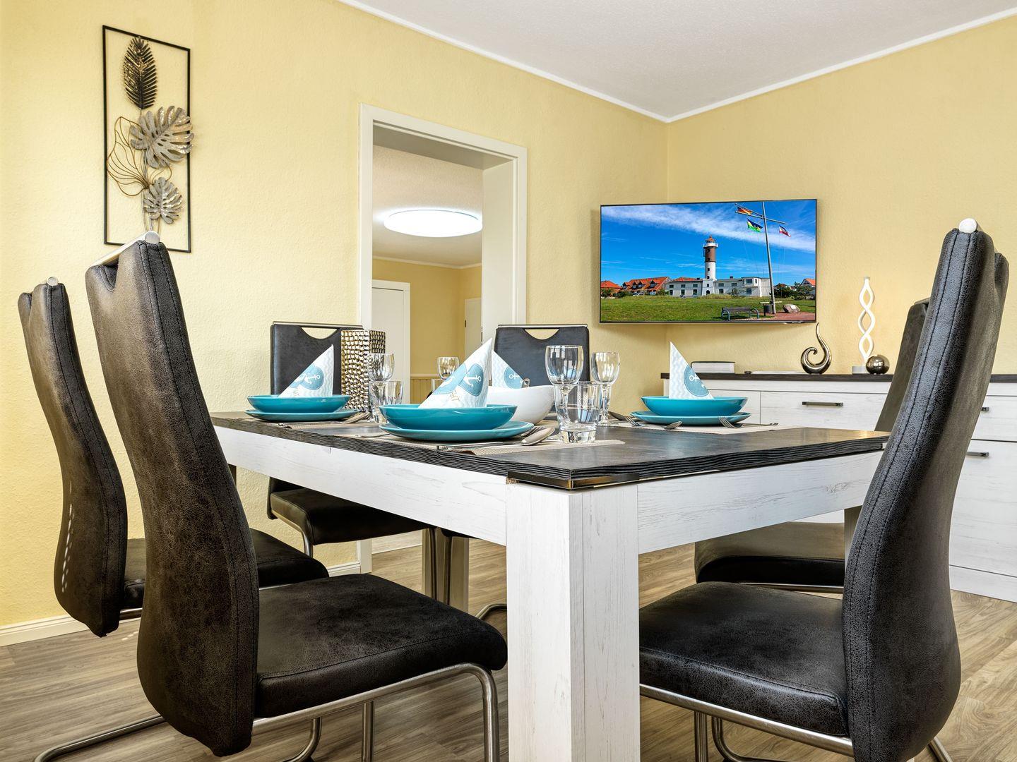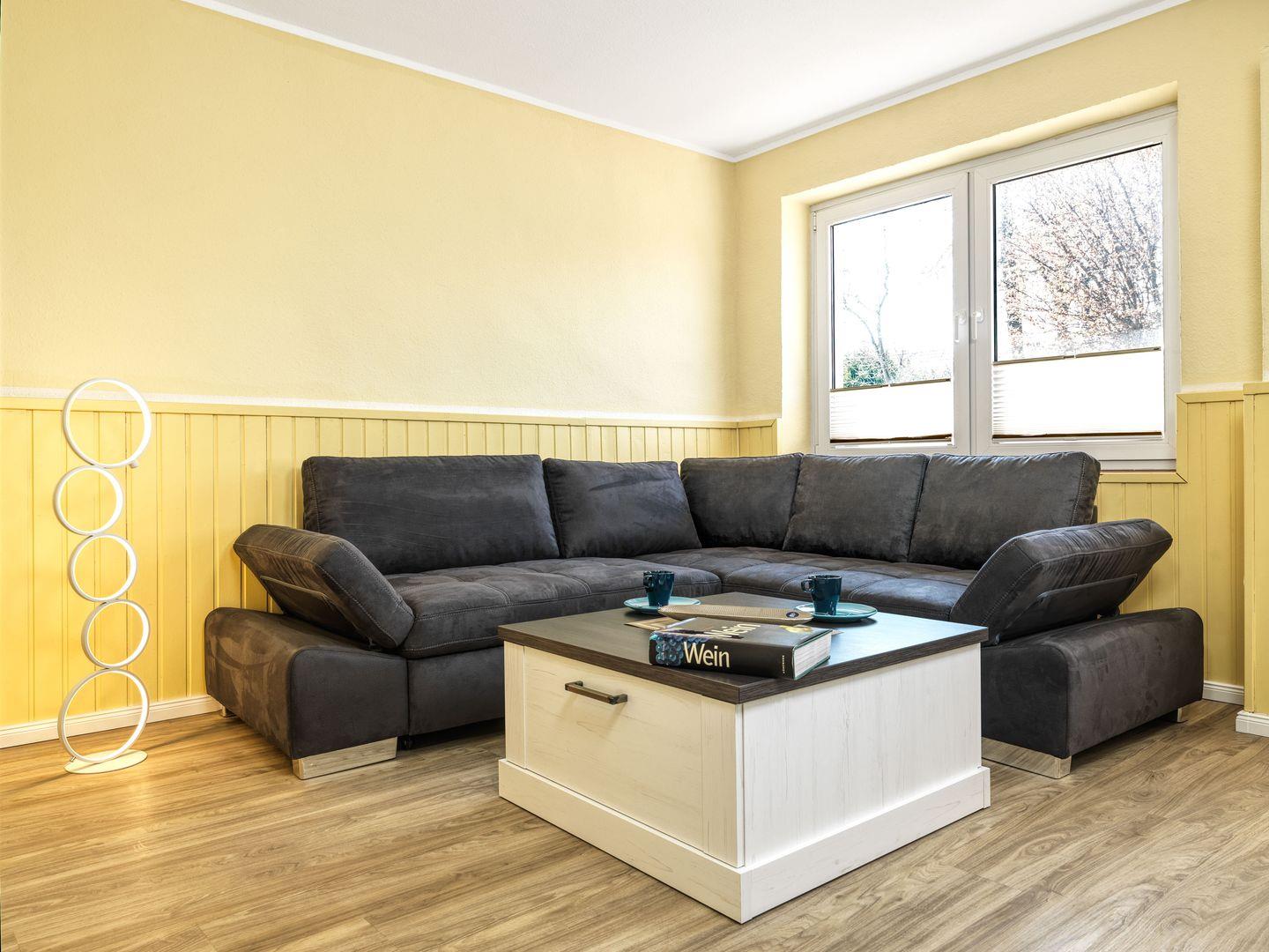 Der große Wohnbereich mit schönem Essplatz, TV und Couchecke bietet Ihnen den Blick ins Grüne Die anschließende Küche mit Mikrowelle, Herd/Backofen, Kühlschrank und vielem mehr macht Ihren Urlaub zu etwas Besonderem.