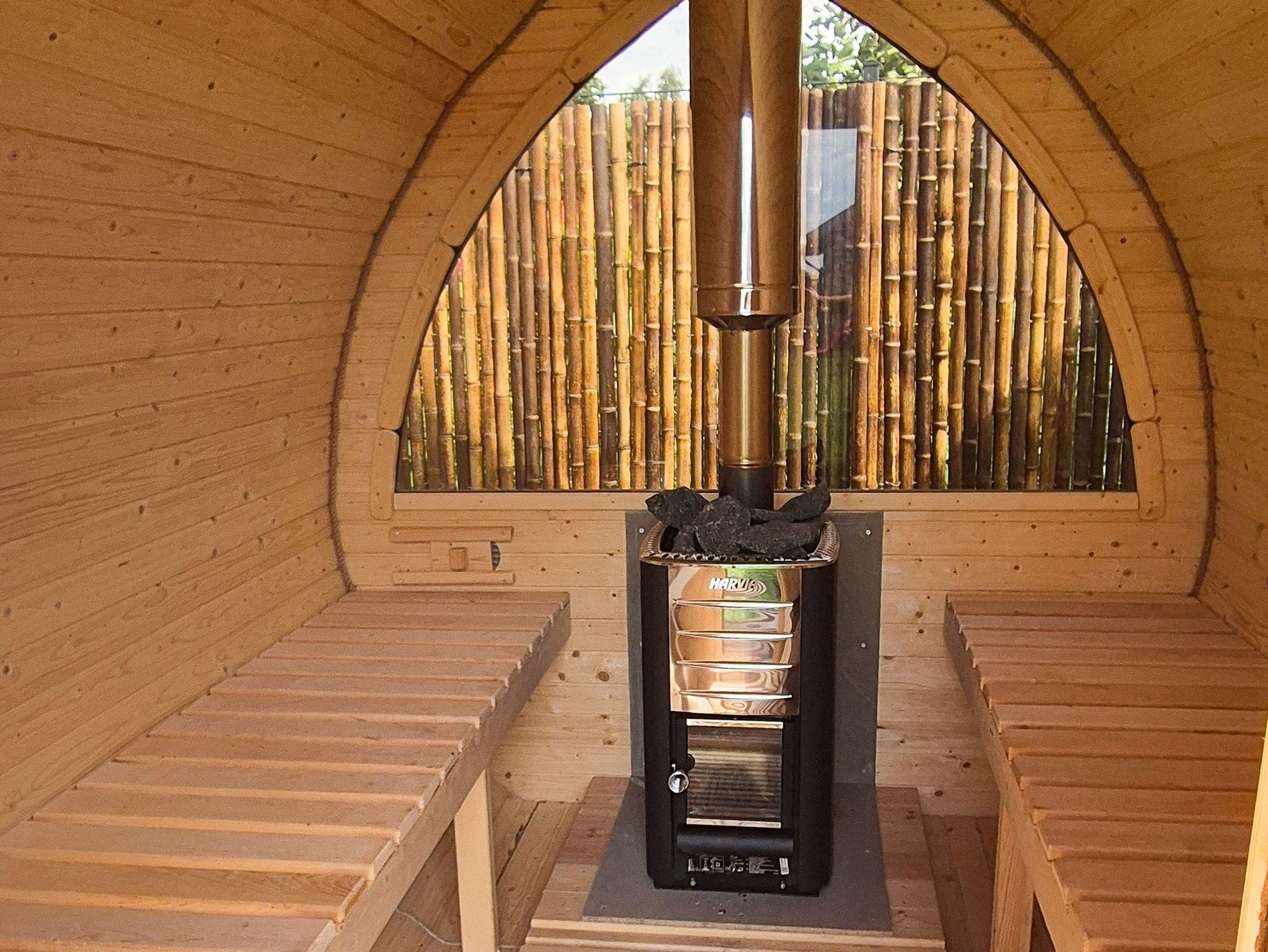 Als besonderes Highlight ist im Garten eine eigene große Sauna und ein beheizbares Badefass zu finden.