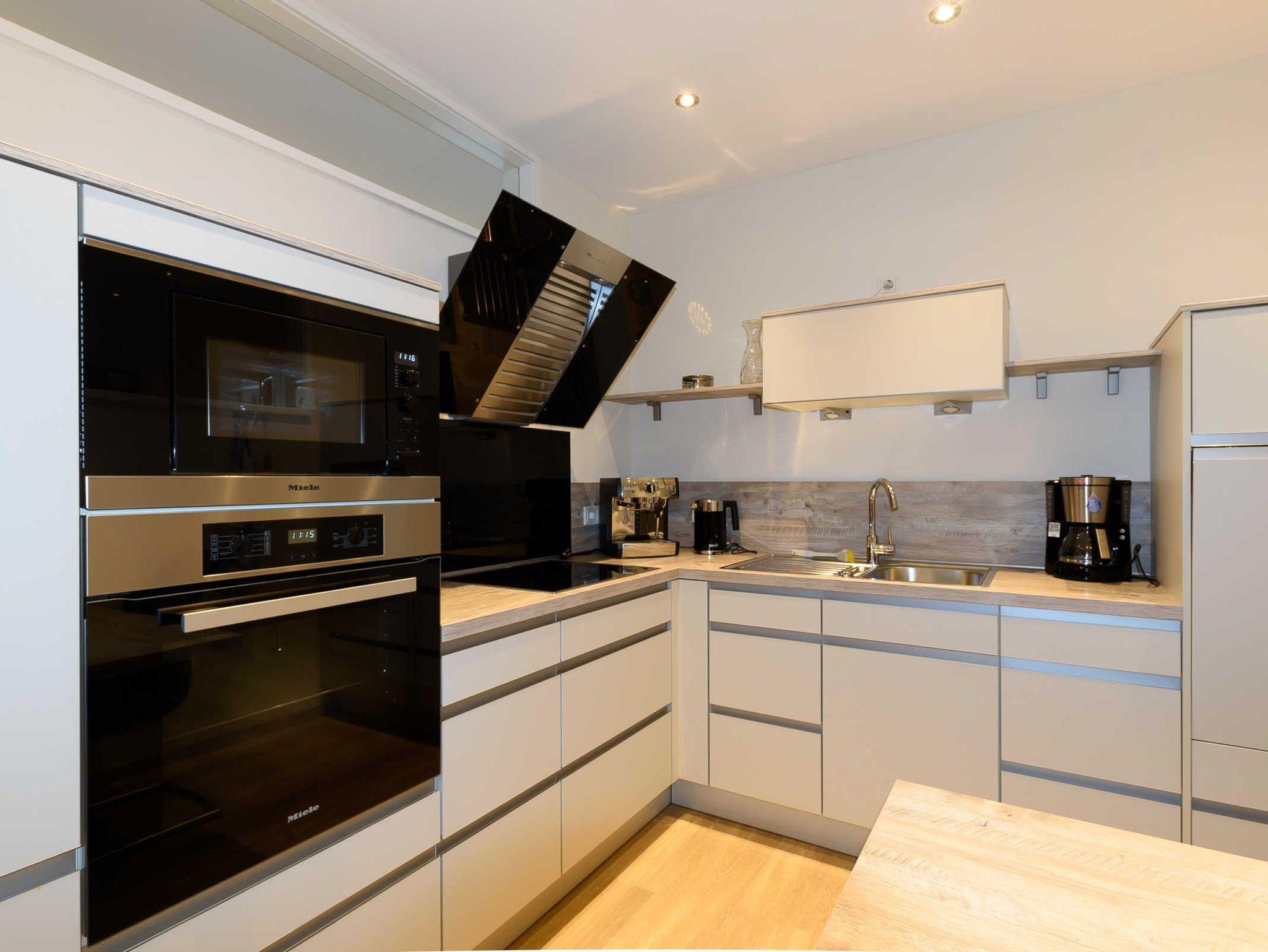 Moderne Küche mit Miele-Einbaugeräten sowohl Siebträger- als auch herkömmliche Kaffeemaschine Eier- und Wasserkocher, Mixer komplettes Koch- und Backgeschirr kleiner Tisch mit Sitzmöglichkeit für 2-3 Personen