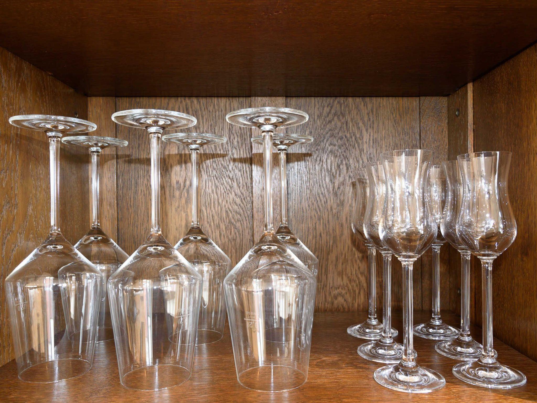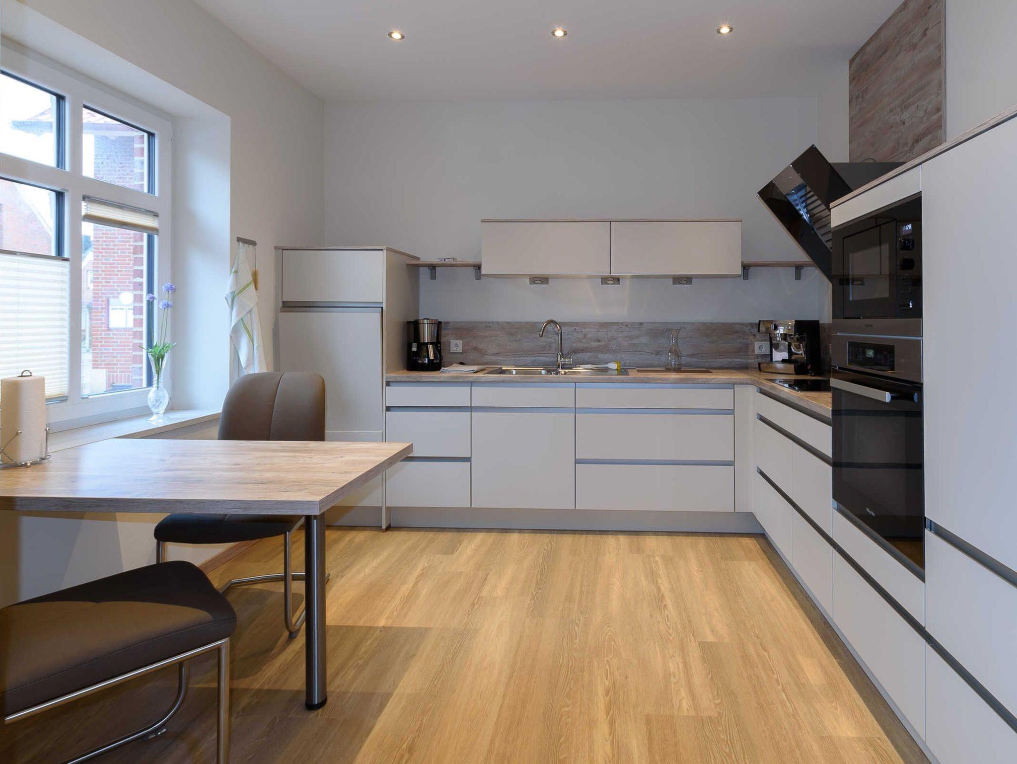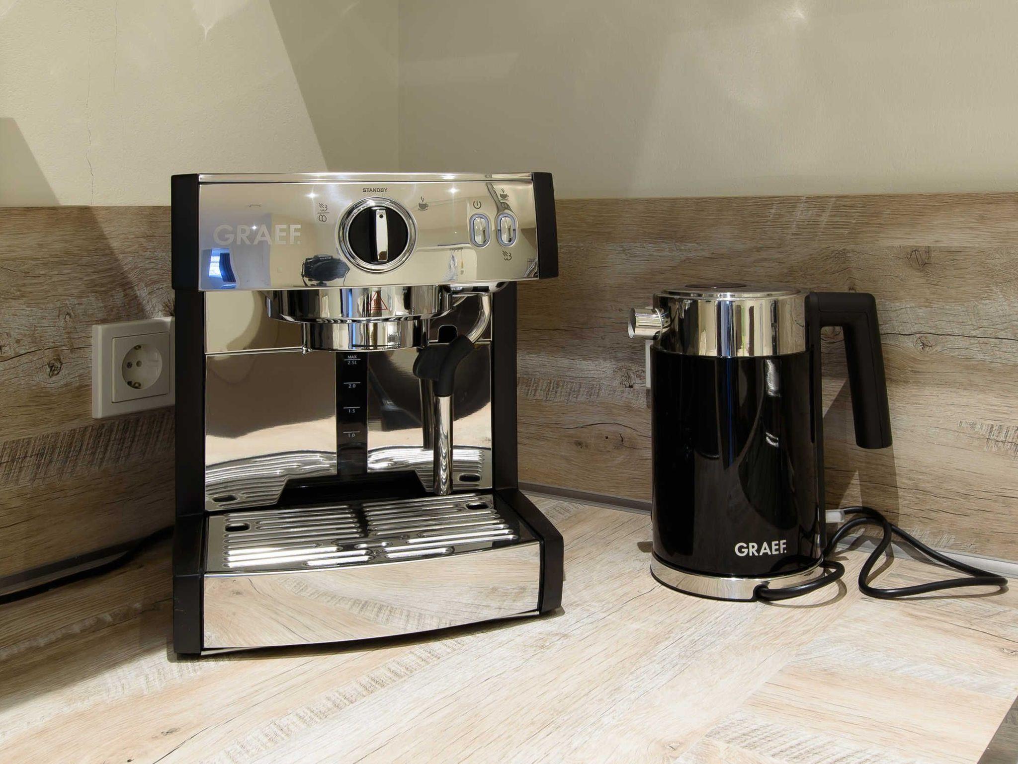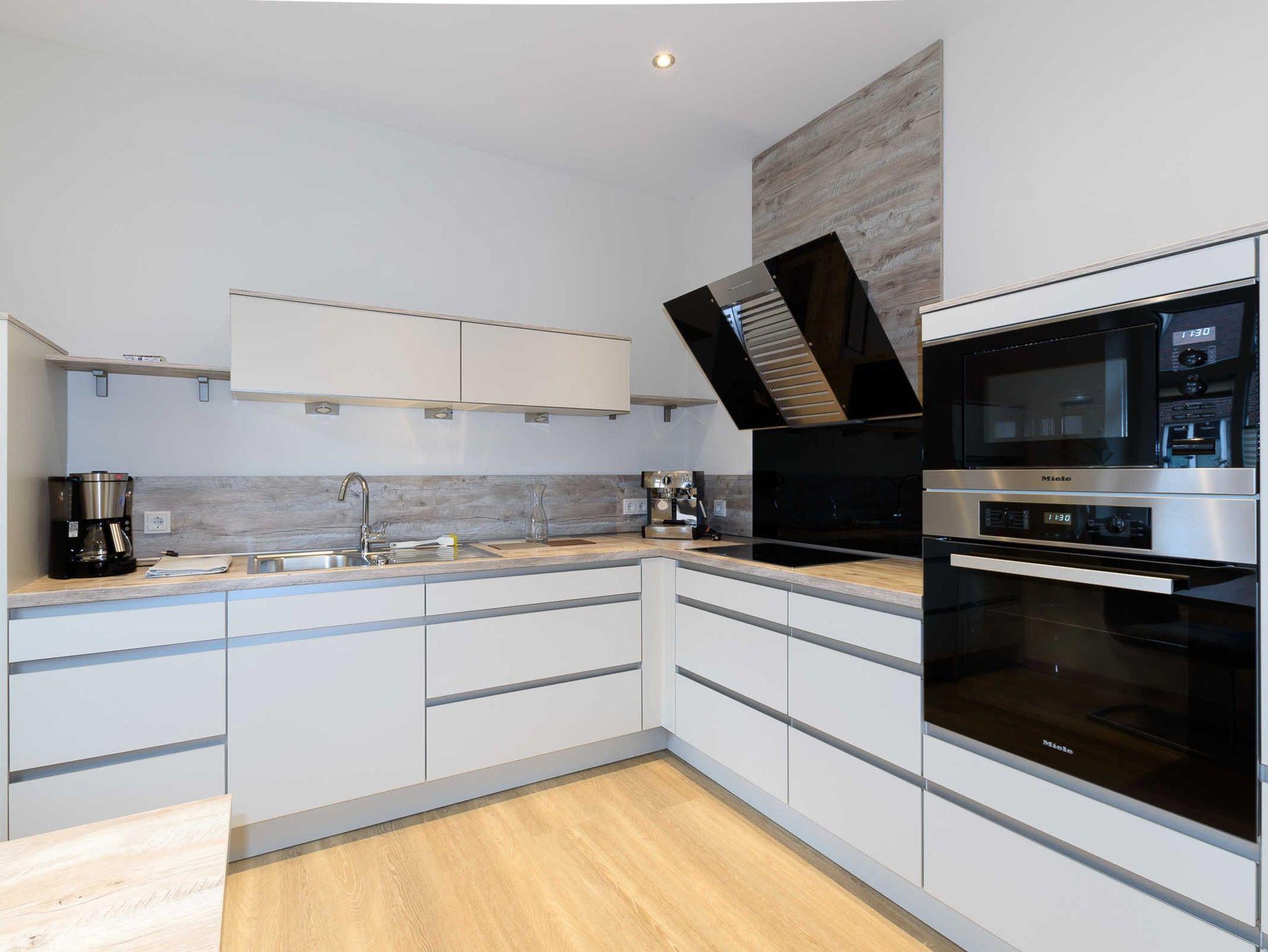 Moderne Küche mit Miele-Einbaugeräten sowohl Siebträger- als auch herkömmliche Kaffeemaschine Eier- und Wasserkocher, Mixer komplettes Koch- und Backgeschirr kleiner Tisch mit Sitzmöglichkeit für 2-3 Personen