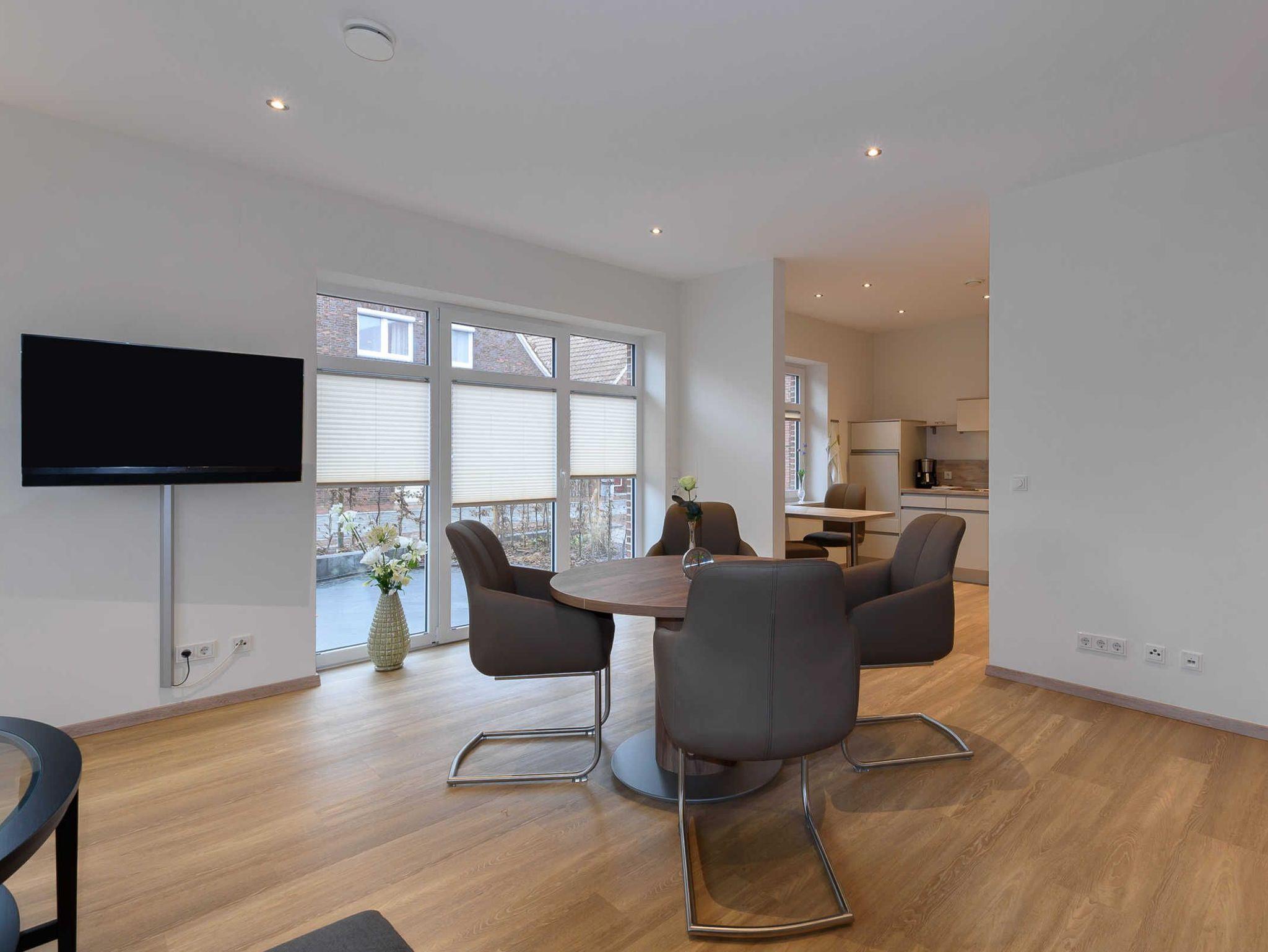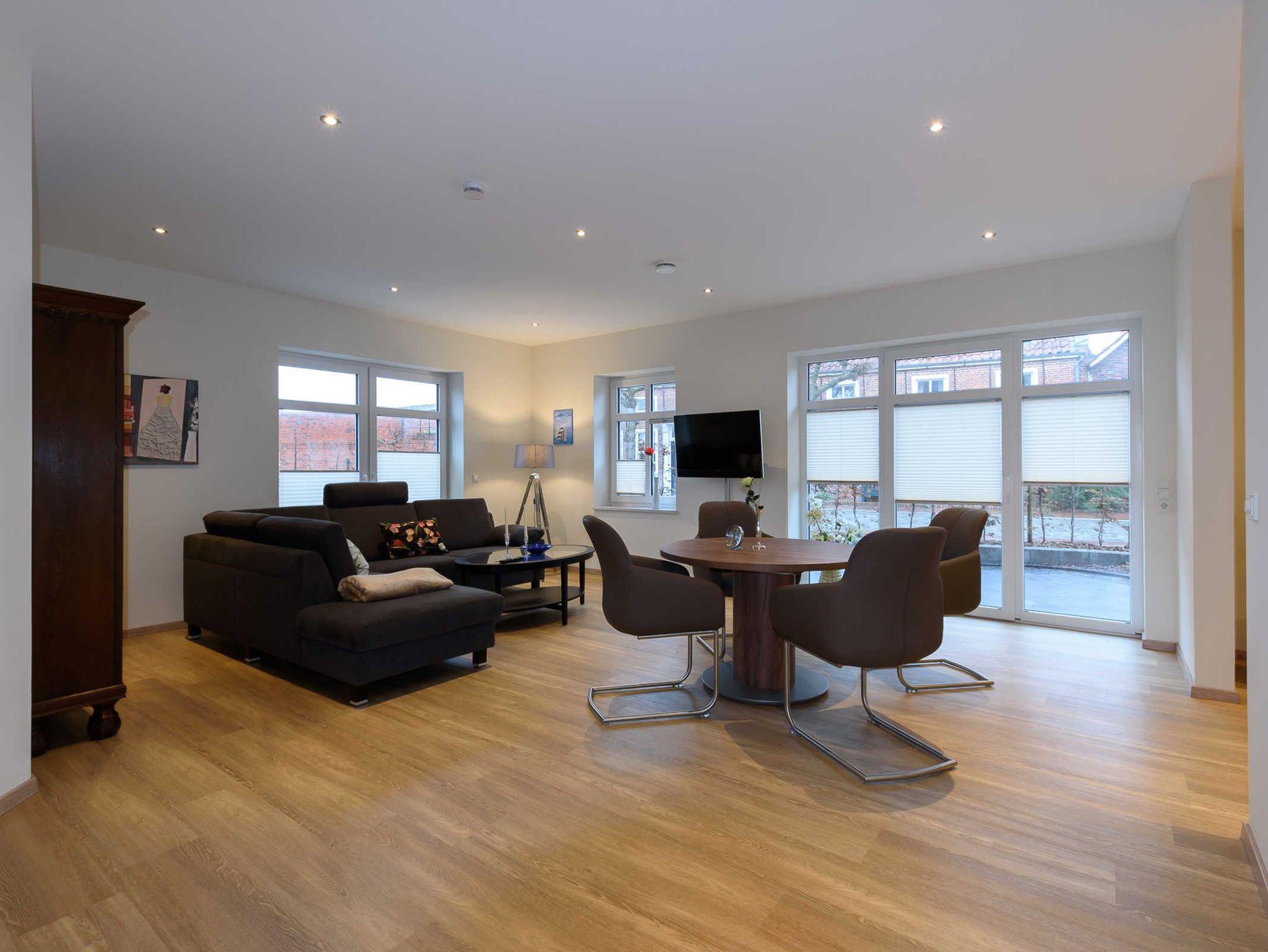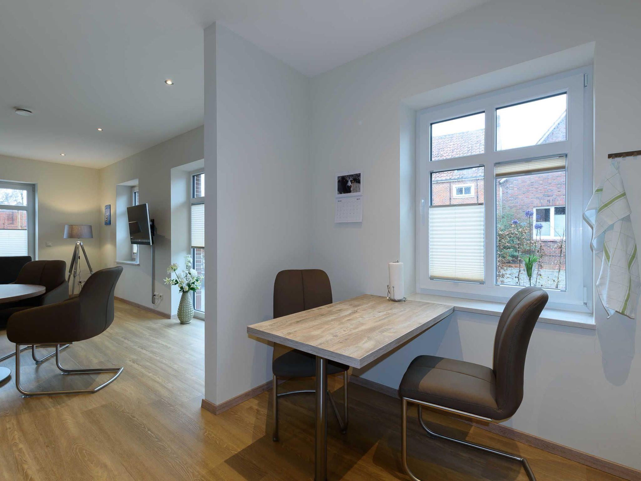 Auch hier gilt: Freie Fahrt für Rollstuhl und Rollator! Genau wie in Wohnung 1 genießen Sie viel Bewegungsfreiheit und erstklassige sanitäre Annehmlichkeiten. Auch immer mehr Gäste ohne Behinderungen wissen diesen außergewöhnlichen Komfort zu schätzen.Sie befindet sich im Erdgeschoss und verfügt über 2 Terrassen, die einmal westseitig, einmal nordseitig ausgerichtet sind. Wohnzimmer und Küche sind durch eine offene Bauweise verbunden. Fußbodenheizung in der ganzen Wohnung kostenfreies WLAN