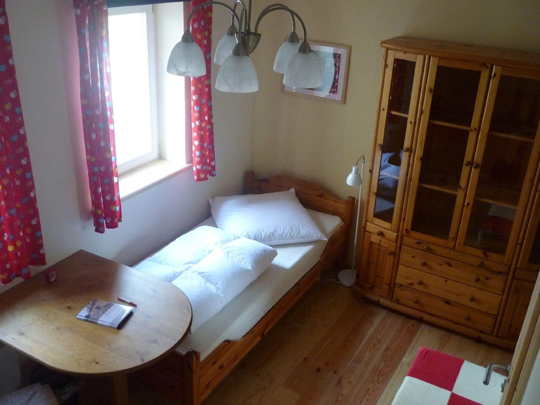 Erdgeschoß, Blick auf den alten Pfarrhof und Garten, Dielung und Vollholzmöbel, Bett 2x0,90 Meter und Hochbett, Aufbettung auf Doppelcouch möglich, Heizung, Nichtraucherzimmer