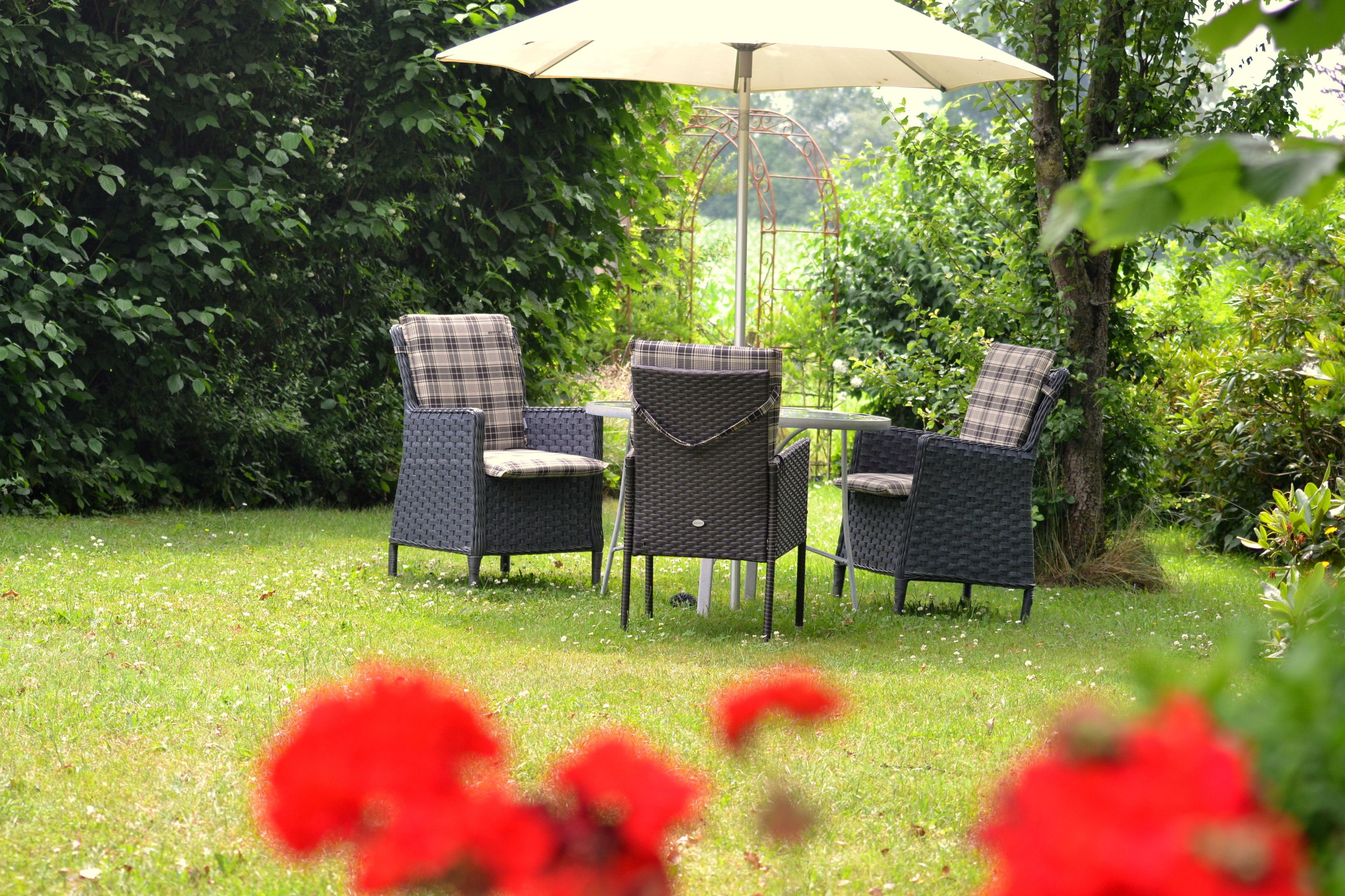 Ab an die frische Luft und den Urlaub im Garten der Ferienwohnung ganz entspannt genießen. Stühle, Liegen und ein Grill stehen Ihnen für einen entspannten Aufenthalt zur Verfügung. Wenn Sie Fahrräder dabeihaben, können diese im Abstellraum untergestellt werden. Außerdem gehört ein PKW-Stellplatz zur Ferienwohnung.