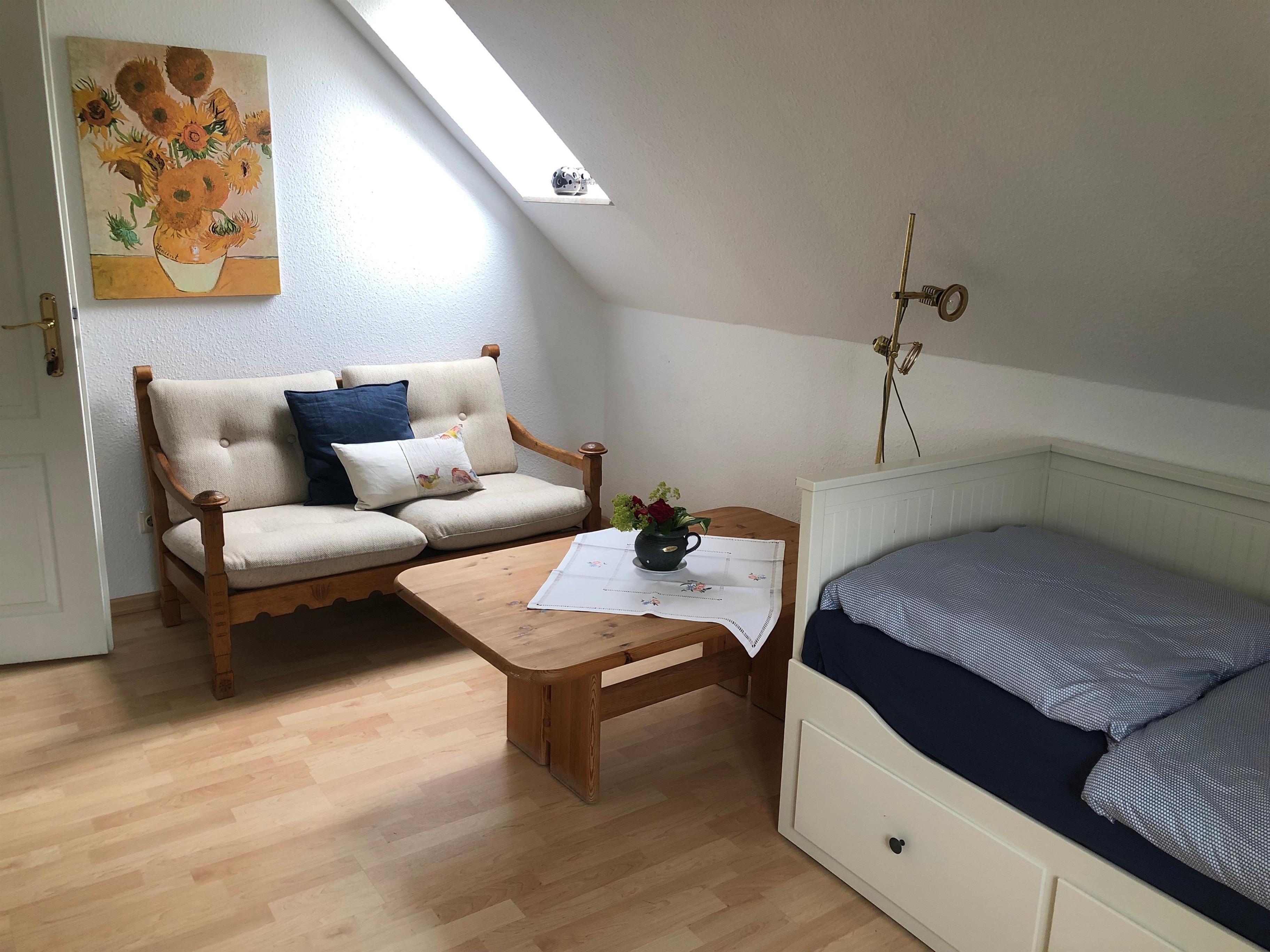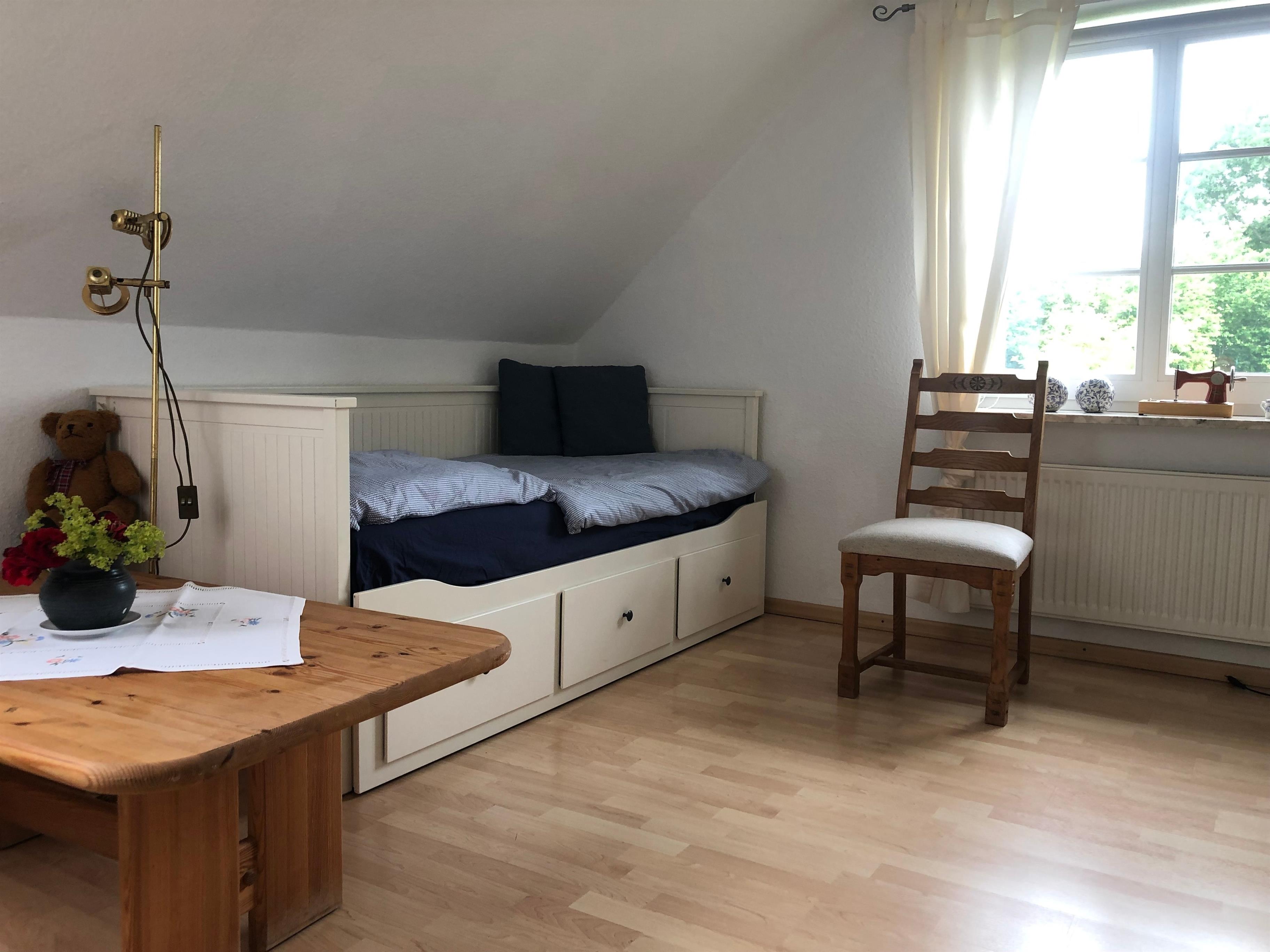 Die im Dachgeschoss gelegene Ferienwohnung bietet auf 60 m² Platz für bis zu 4 Personen. Die Wohnung verfügt über 2 Schlafzimmer, ein Badezimmer, eine Küche, ein Wohnzimmer sowie eine Liegewiese vor dem Haus.