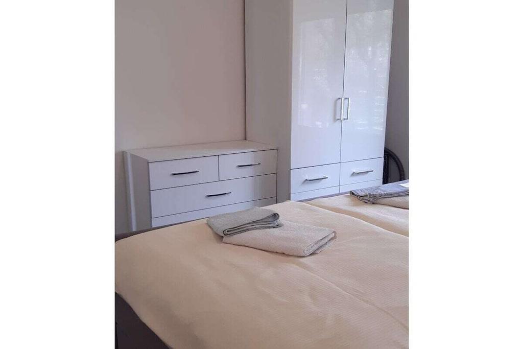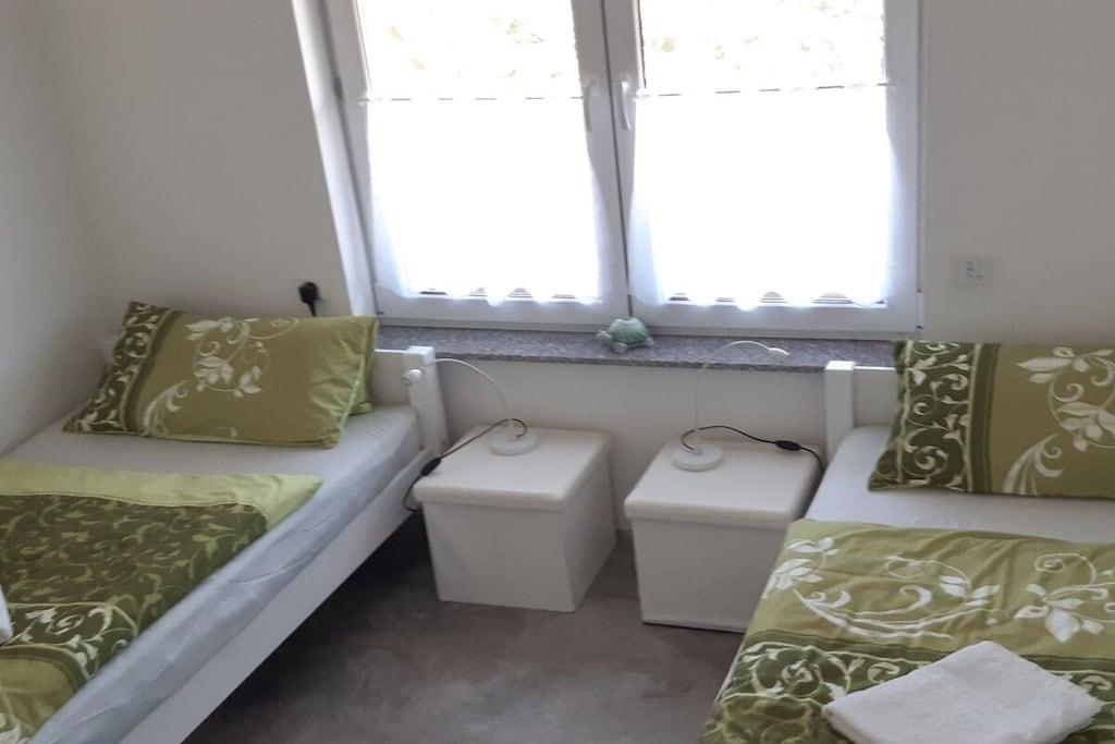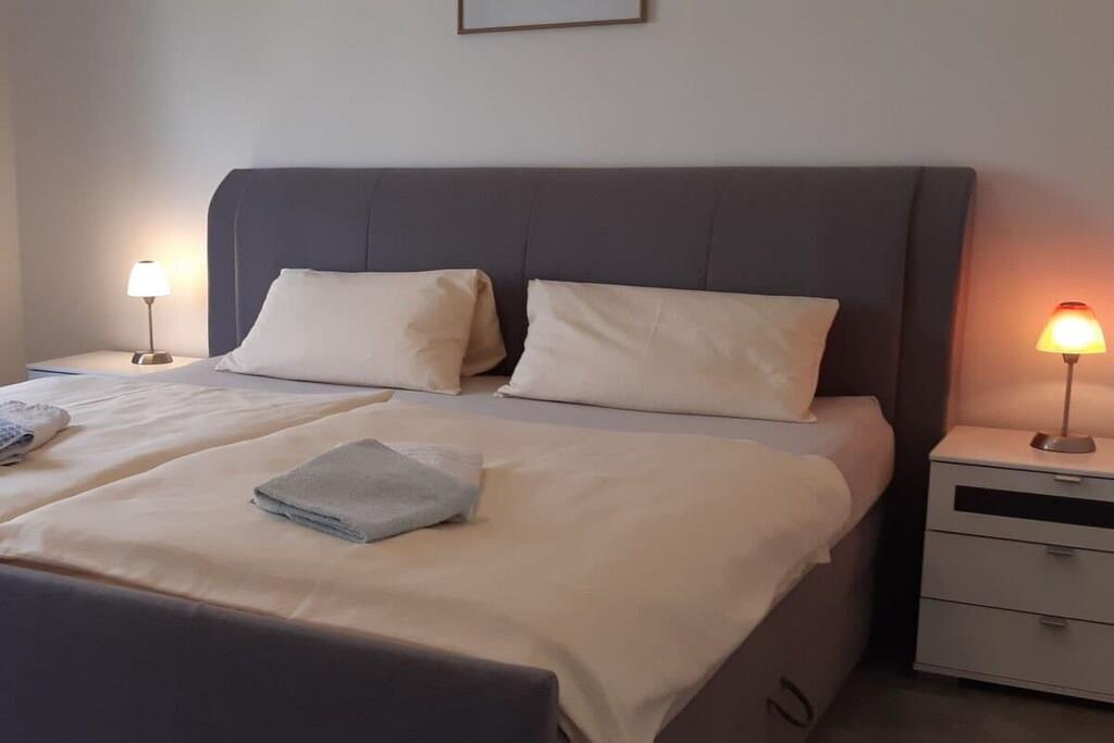 Ferielejligheden i vores feriehus, nybygget i 2016, ligger direkte på badeplænen ved Grimnitz-søen. Lejligheden er tilgængelig for kørestolsbrugere, og stien fra parkeringspladsen til søen er også handicapvenlig. Den komfortabelt møblerede lejlighed har to soveværelser, et med en boxmadras og det andet med to enkeltsenge, et brusebad og et rummeligt spisekøkken med keramisk kogeplade, opvaskemaskine, køleskab, miniovn, elkedel og alt nødvendigt service og redskaber. Efter anmodning kan vi stille en brusestol til rådighed for vores gæster. Huset ligger på en indhegnet grund med bord og stole udenfor samt en grill. Der er en privat parkeringsplads til rådighed for din bil foran ejendommen.