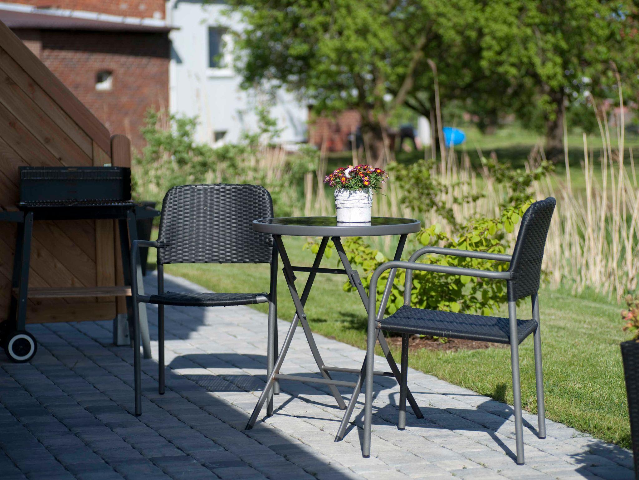 Ferienwohnung mit zwei Schlafräumen. Wohnzimmer mit Küchenzeile, Badezimmer sowie Terrasse zum Obsthof.