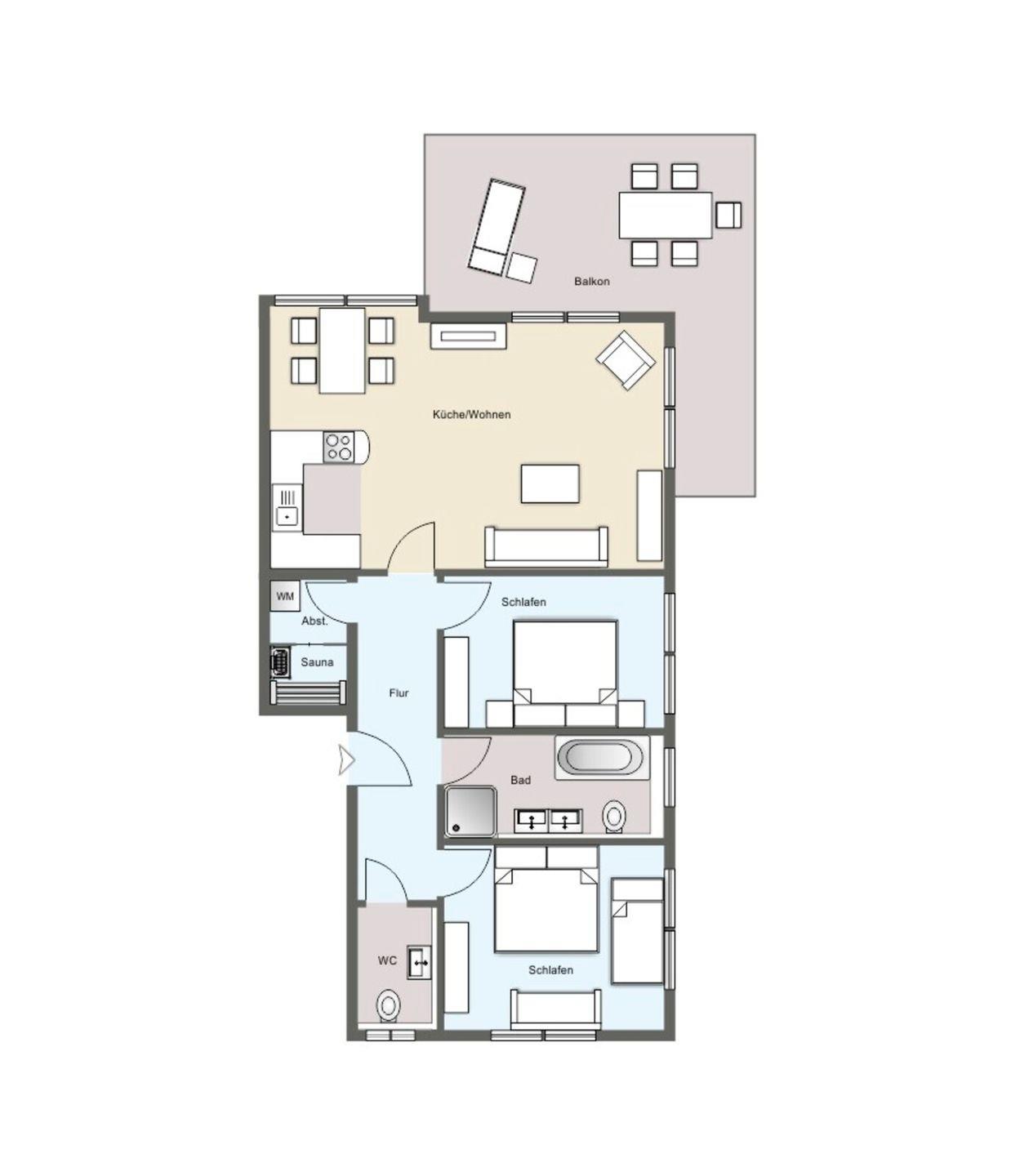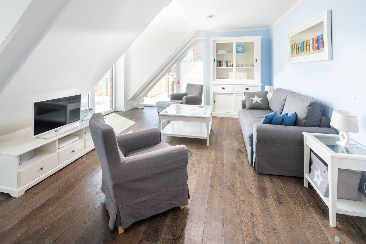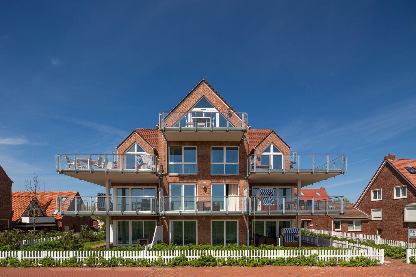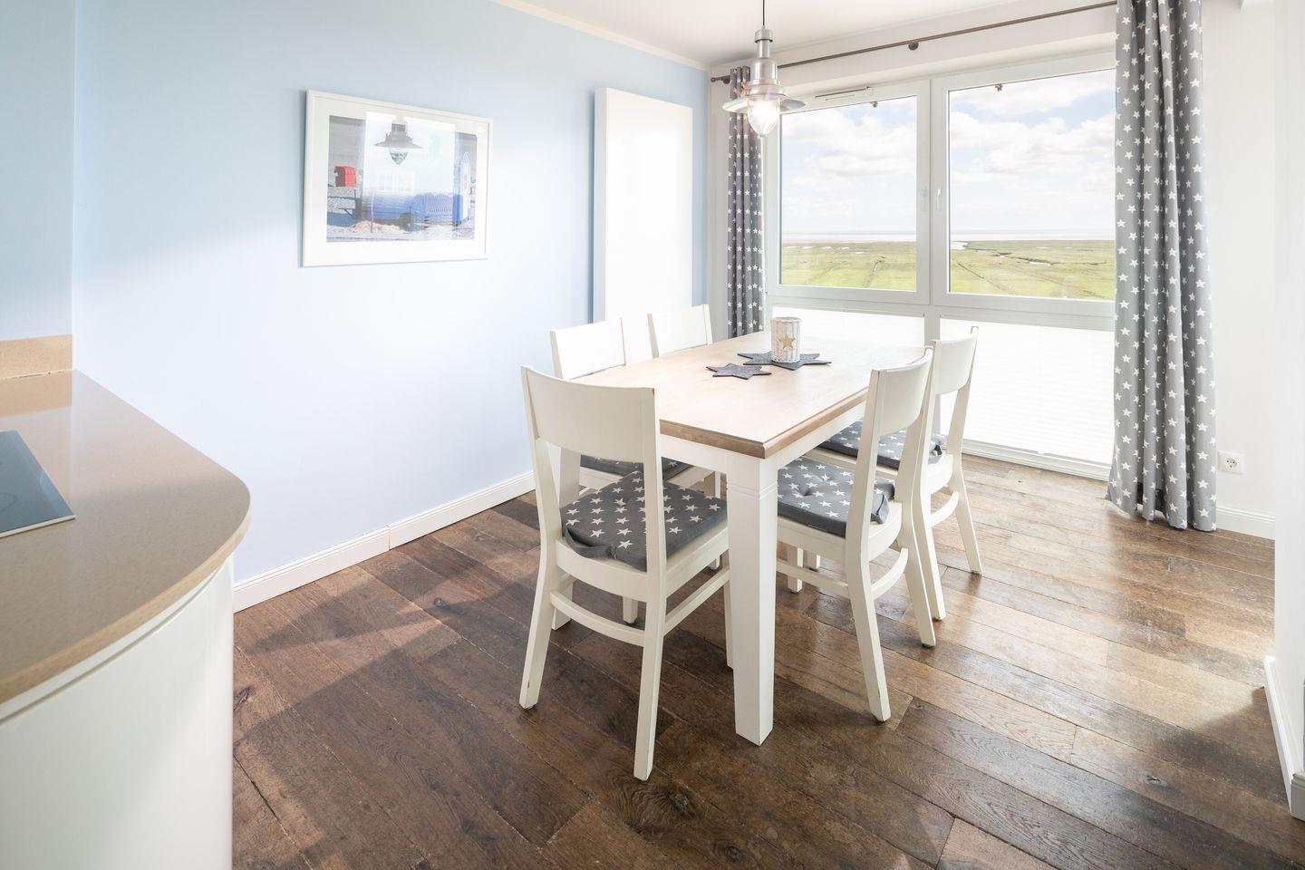 Hinter dieser Eingangstür befindet sich ein geschmackvolles und luxuriös eingerichtetes Zuhause. In hellen Farben harmonisch abgestimmt vermittelt jeder Raum seinen eigenen Charme. Die geschmackvolle Einrichtung der Ferienwohnung bietet optimale Bedingungen für einen Traumurlaub für 2 bis 5 Personen. Alle anderen Räume vermitteln ebenfalls luxuriöse und perfekte Grundlage für Ihre Urlaubstage auf Juist. 2 Schlafzimmer, Wohnküche, Duschbad, Gäste-WC, Abstellraum, Flur und ein Südbalkon mit Blick zum Watt sowie über die Dünenlanschaft gehören zur Ausstattung der Ferienwohnung. Der traumhafte Freisitz auf dem nach Süden ausgerichteten Balkon bietet Raum zum Relaxen und Sonnenbaden.