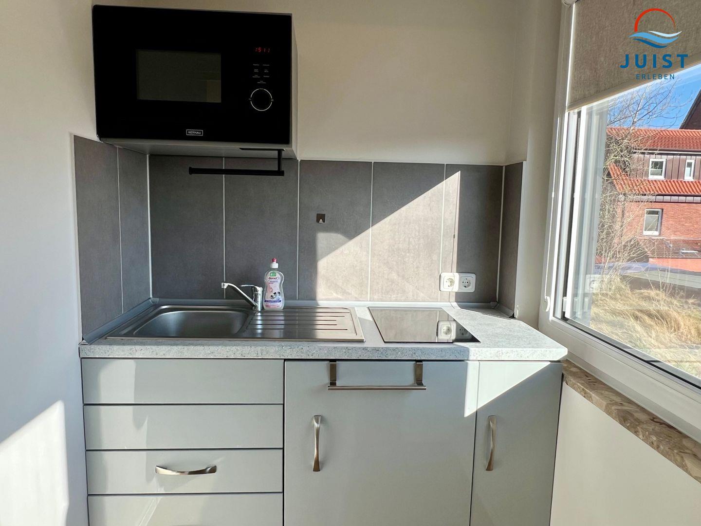 Die praktische Küchenzeile ist gut ausgestattet, sodass Sie sich im Urlaub bequem selbst versorgen können. Sie verfügt unter anderem über einen Herd, einen Kühlschrank, eine Mikrowelle mit Backofenfunktion sowie eine Kaffeemaschine, einen Wasserkocher und einen Toaster.