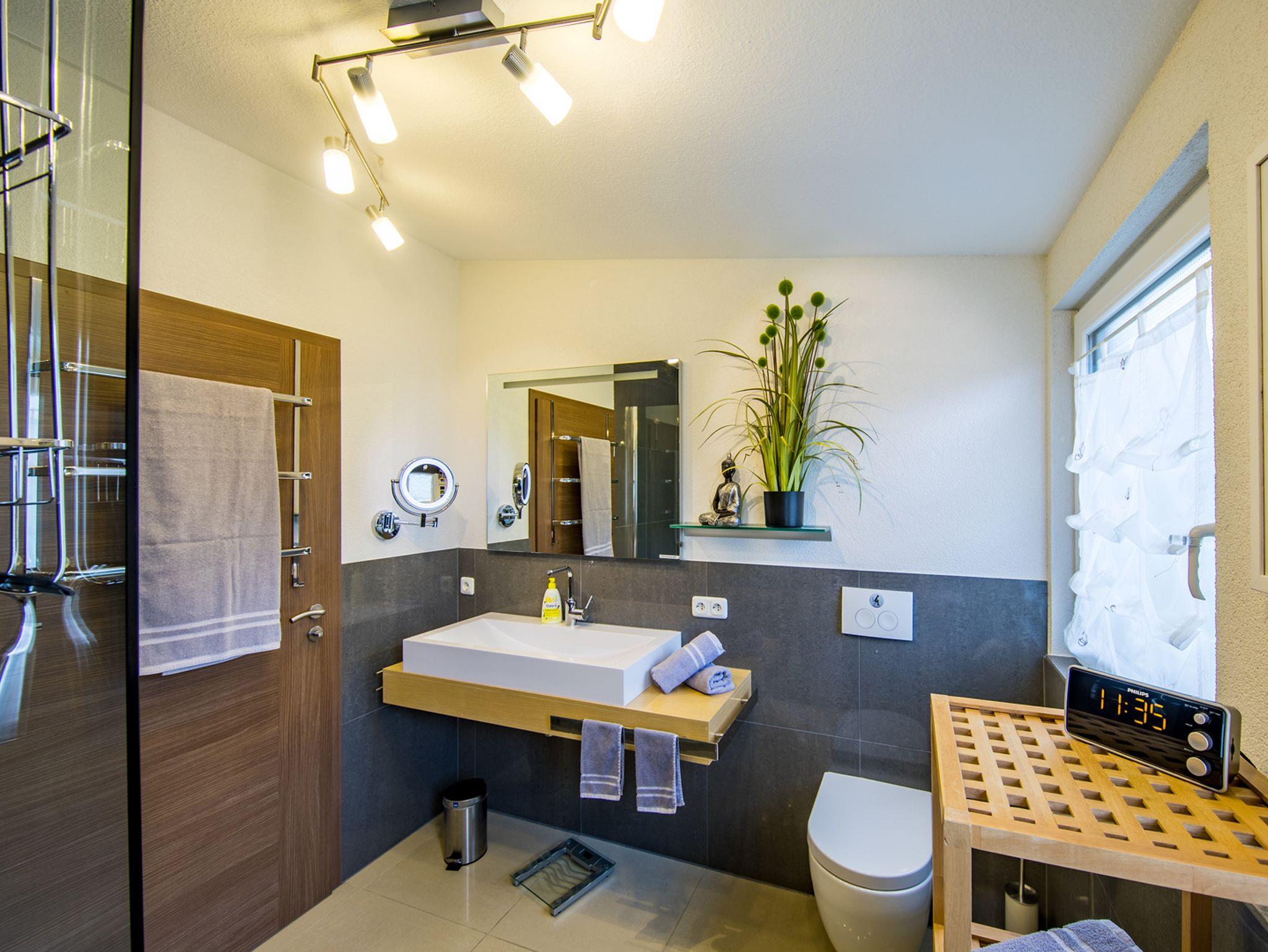Die Dachgeschossferienwohnung ist 68 qm groß, komfortabel, Allergikergerecht, modern und neu eingerichtet. Die Küche ist komplett ausgestattet mit Geschirrspüler, Ceran-Kochfeld, Mikrowelle, Kühlschrank mit Gefrierfach, Radio, Sitzecke. Die Schlafzimmerausstattung besteht aus einem Massivholzbett mit hochwertigen Dunlopillo Matratzen und einem Flachbildschirm. Im Kinderzimmer steht ein Bett 90 x 200 cm.Die Wohnzimmerausstattung umfasst einen Fernseher, Blue Ray Player, Schlafcouch, und eine zusätzliche Essecke. Es gibt ein neu eingerichtetes Badezimmer mit 140 x 90 cm begehbarer Dusche. Darüber hinaus steht eine Unterstellmöglichkeit für Fahrräder zur Verfügung. Bei Bedarf stehen eine Waschmaschine und ein Trockner zur Verfügung.
