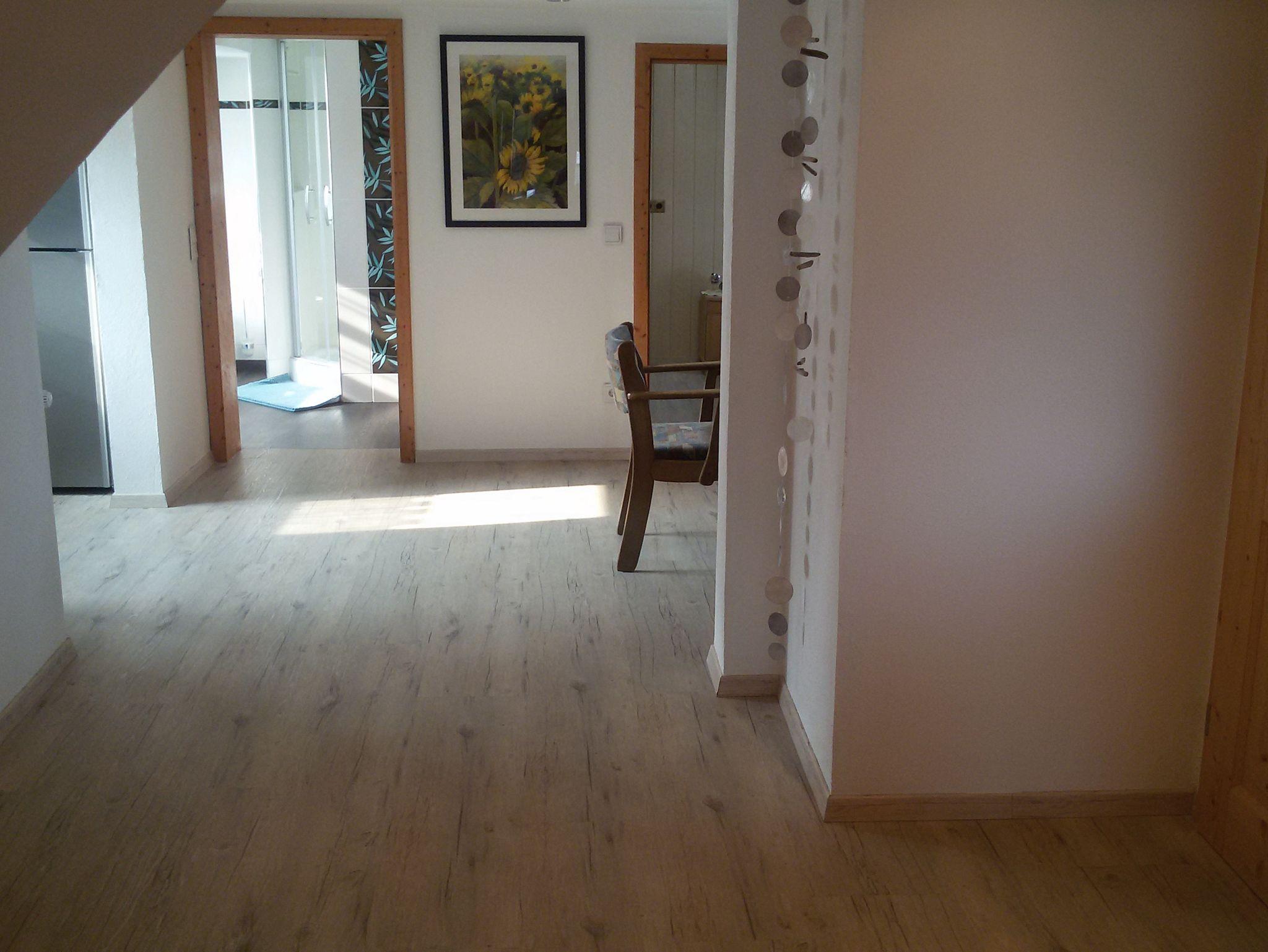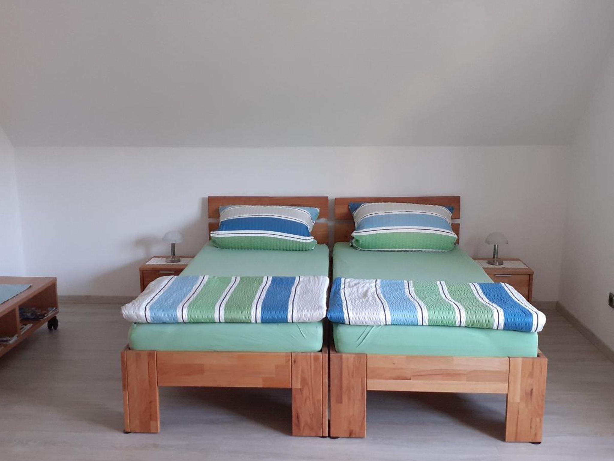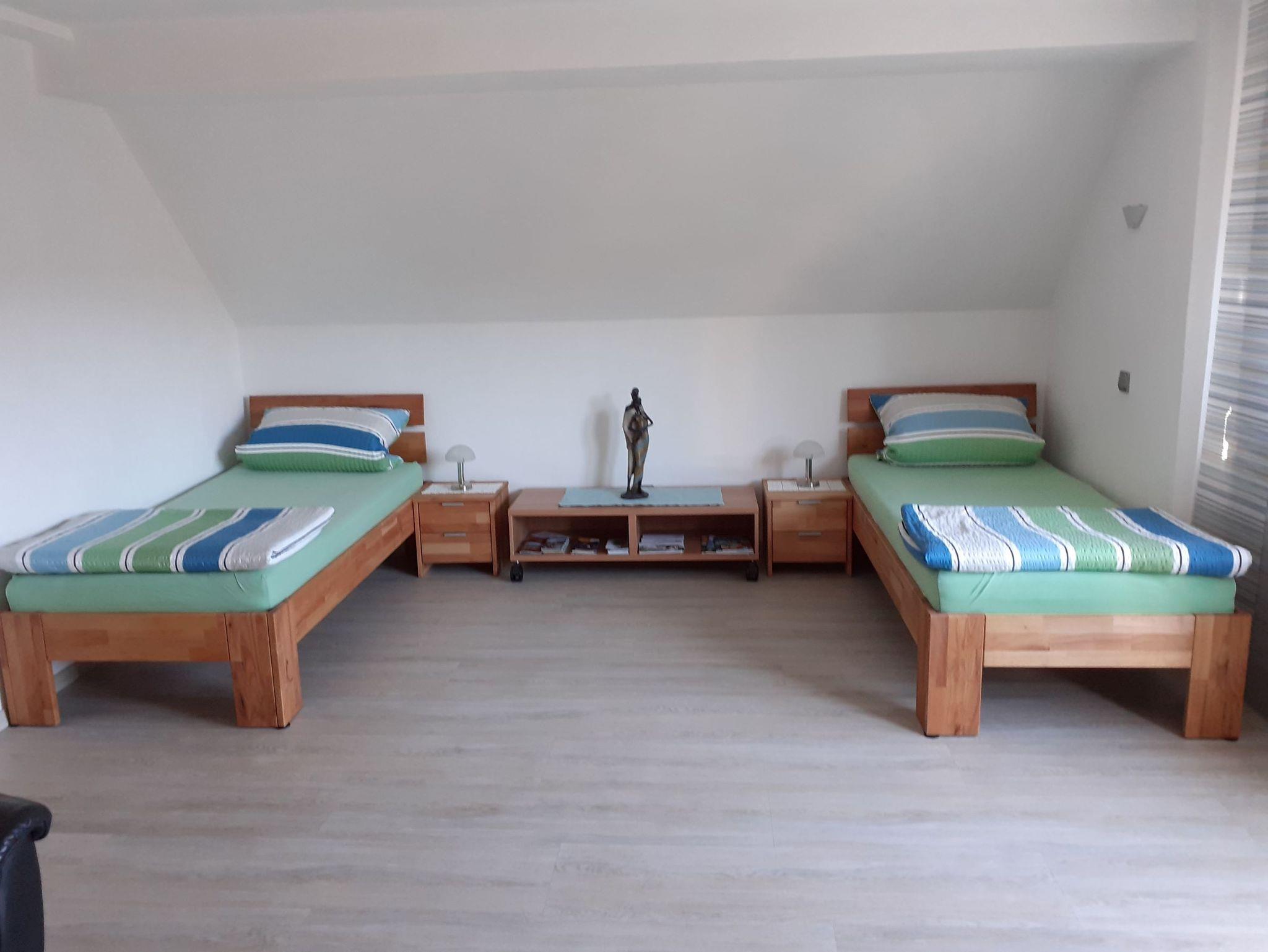 Die Ferienwohnung (67qm) befindet sich im Dachgeschoss unseres Hauses und bietet Platz für 4 Personen, mit Zustellbett sogar für 5 Personen. Sie verfügt über ein Schlafzimmer mit französischem Bett (1,40 x 2m )mit Flachbild-TV, und ein Wohn-Schlafzimmer mit 2Einzelbetten (die man auch zu einem Doppelbett zusammen stellen kann ) und Sitzbereich mit Flachbild-TV. Die komplett ausgestattete Küche mit Geschirrspüler, Kühlschrank, Herd, Backofen, Wasserkocher und Toaster lässt keine Wünsche offen. Einem geräumigen Badezimmer mit Dusche, WC, Waschtisch mit großem Spiegel, Fön und eine Waschmaschine mit integriertem Trockner rundet das Gesamtbild ab. Eine kleine Sitzgruppe und Parkmöglichkeit befindet sich vorm Haus. Bettwäsche und Handtücher sind vorhanden.