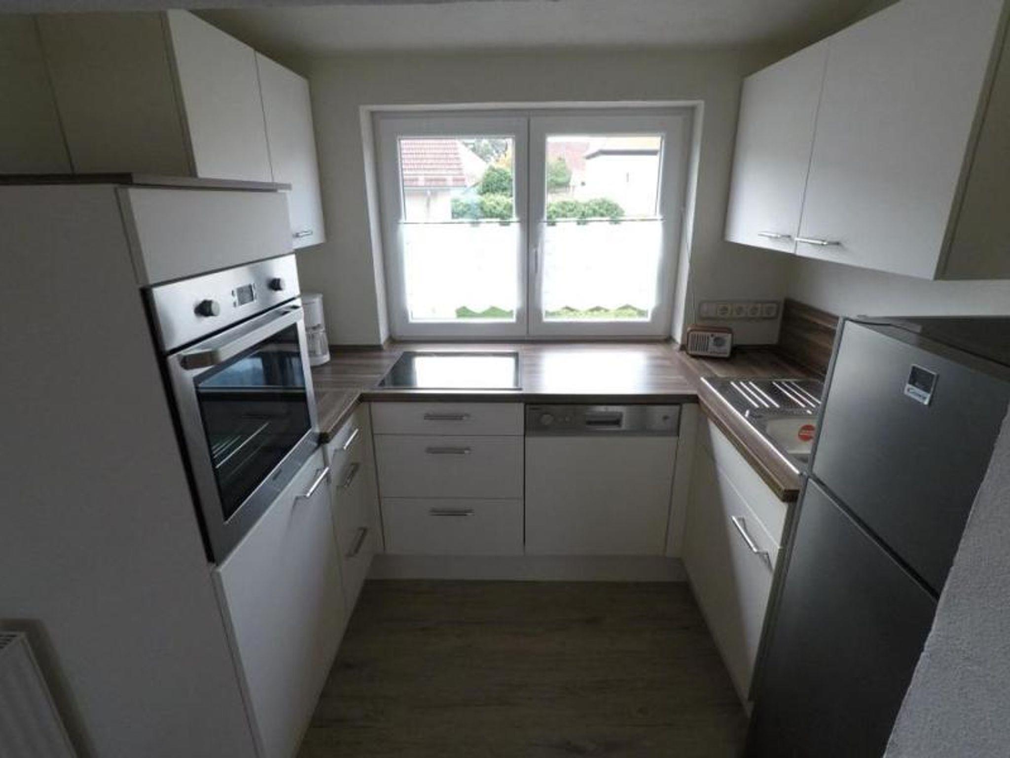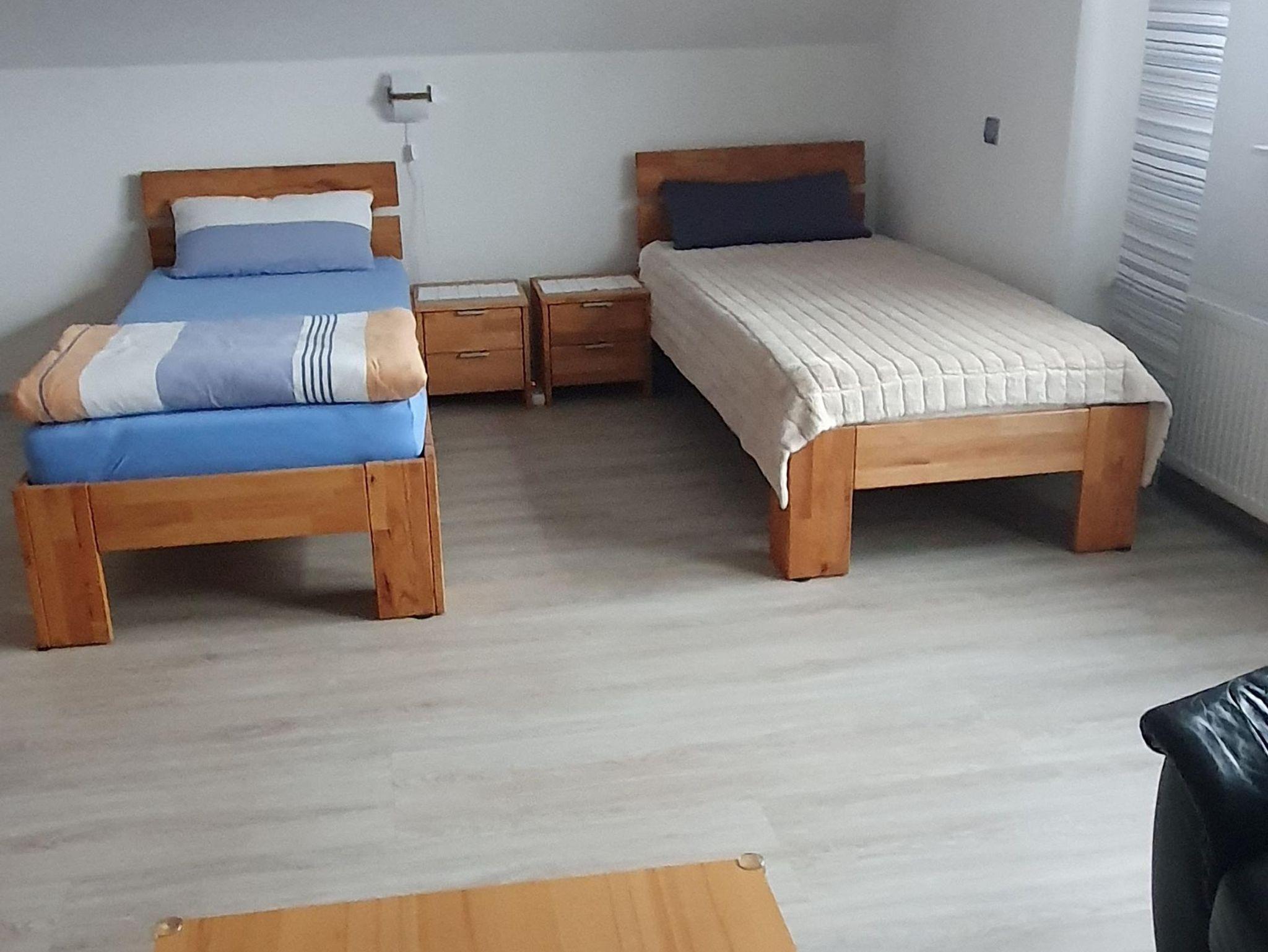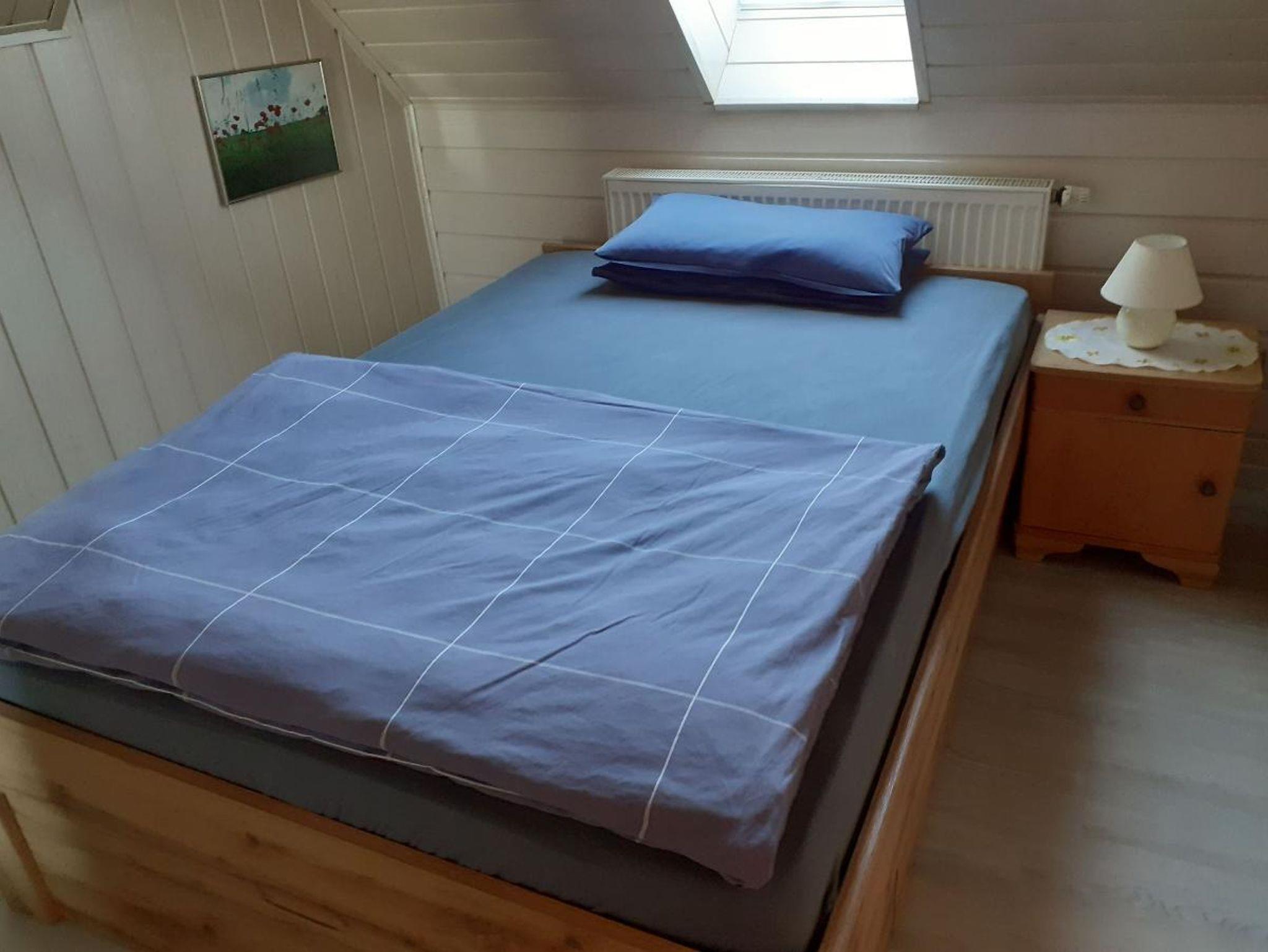 Die Ferienwohnung (67qm) befindet sich im Dachgeschoss unseres Hauses und bietet Platz für 4 Personen, mit Zustellbett sogar für 5 Personen. Sie verfügt über ein Schlafzimmer mit französischem Bett (1,40 x 2m )mit Flachbild-TV, und ein Wohn-Schlafzimmer mit 2Einzelbetten (die man auch zu einem Doppelbett zusammen stellen kann ) und Sitzbereich mit Flachbild-TV. Die komplett ausgestattete Küche mit Geschirrspüler, Kühlschrank, Herd, Backofen, Wasserkocher und Toaster lässt keine Wünsche offen. Einem geräumigen Badezimmer mit Dusche, WC, Waschtisch mit großem Spiegel, Fön und eine Waschmaschine mit integriertem Trockner rundet das Gesamtbild ab. Eine kleine Sitzgruppe und Parkmöglichkeit befindet sich vorm Haus. Bettwäsche und Handtücher sind vorhanden.