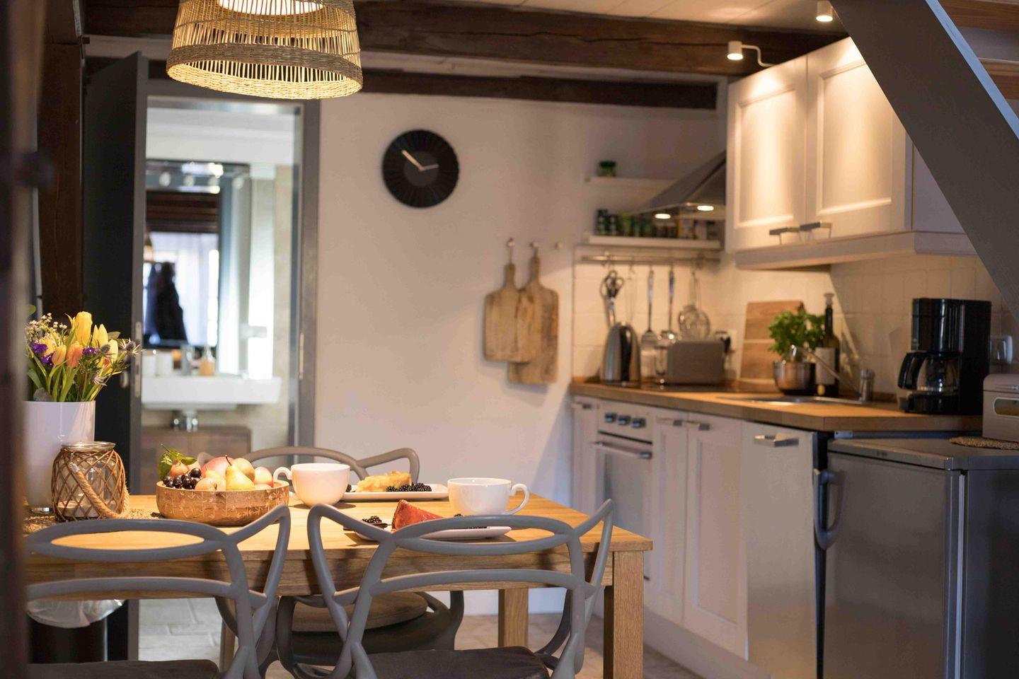 Die 42 m² große Ferienwohnung erstreckt sich über zwei Ebenen und bietet Platz für bis zu vier Personen. Im Wohn- und Essbereich empfängt Sie warmes Licht, ein gemütliches Sofa, Flachbild-TV und eine voll ausgestattete Küche mit Induktionsherd, Backofen, Geschirrspüler und Kaffeemaschine – perfekt für gemeinsame Kochabende.