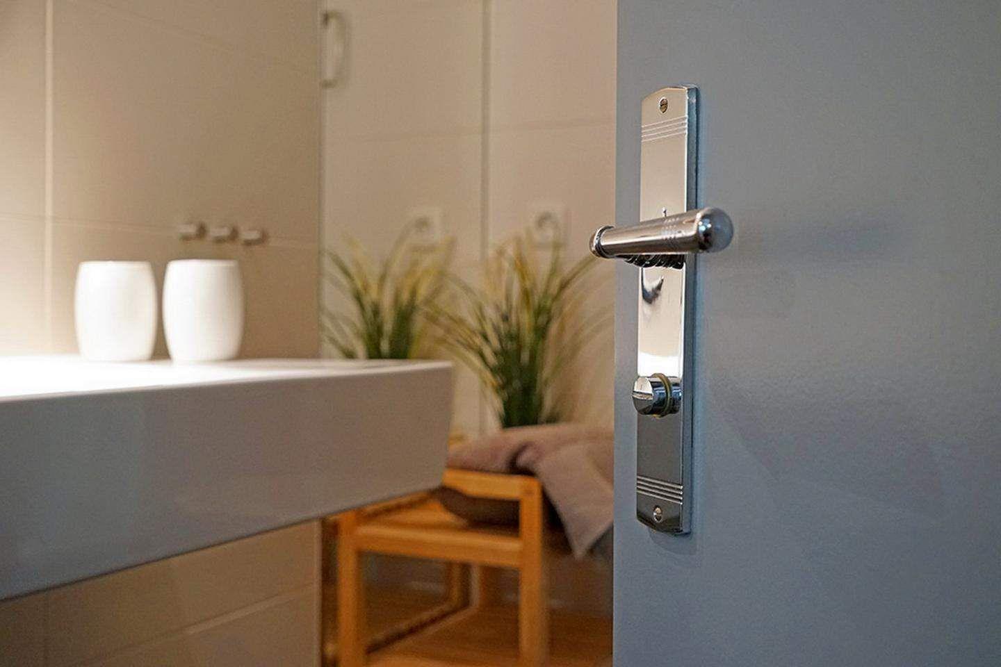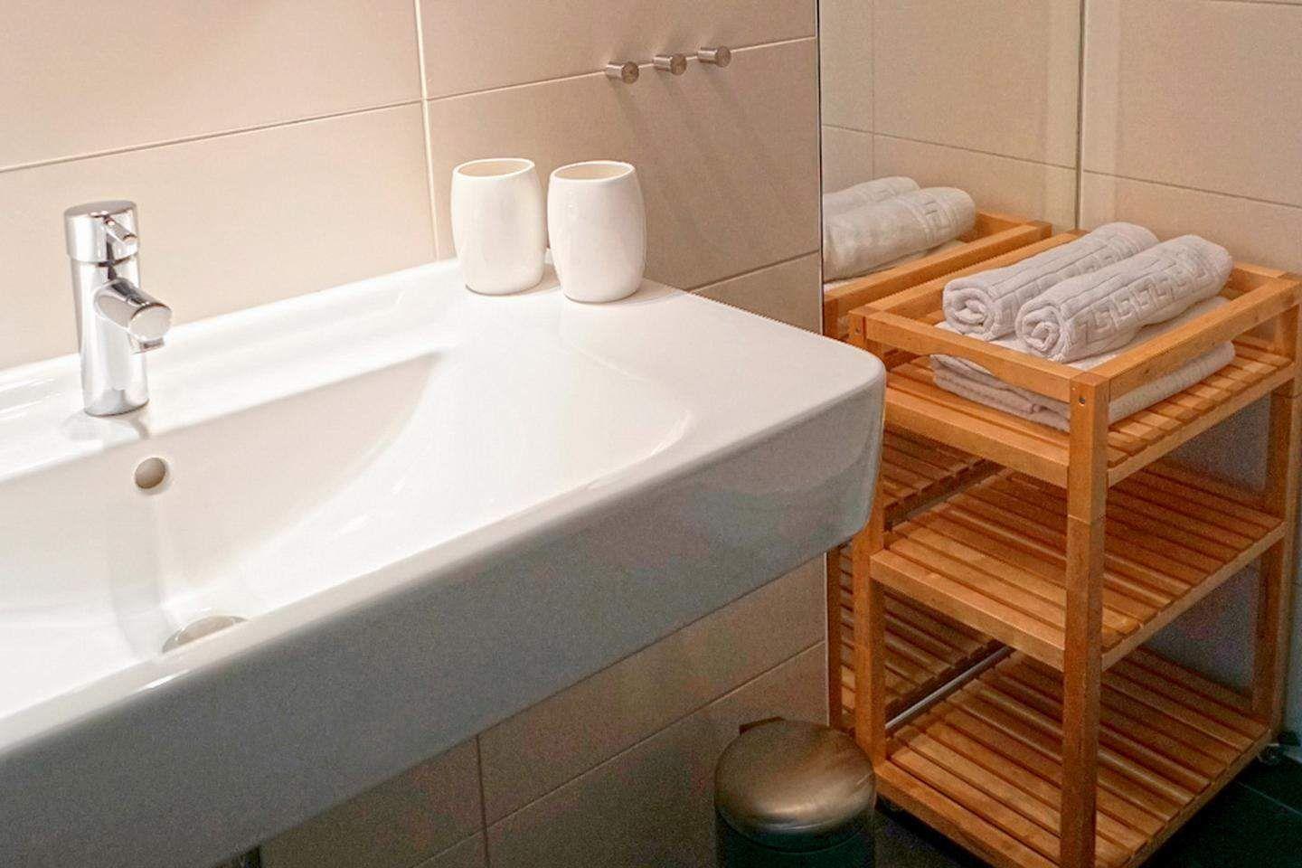 Das Badezimmer mit Dusche und WC ist modern ausgestattet und bietet ausreichend Platz. Die Einrichtung in warmen Terrakotta- und Naturtönen schafft eine wohltuende, entspannte Atmosphäre. WLAN steht kostenfrei zur Verfügung, Waschmaschine und Trockner können gegen Gebühr genutzt werden.