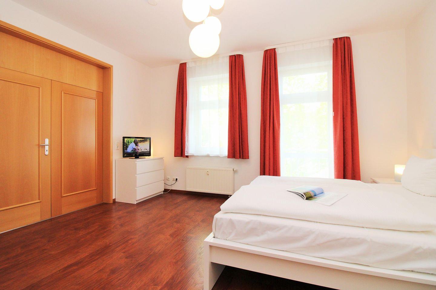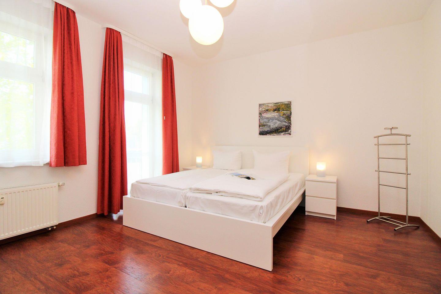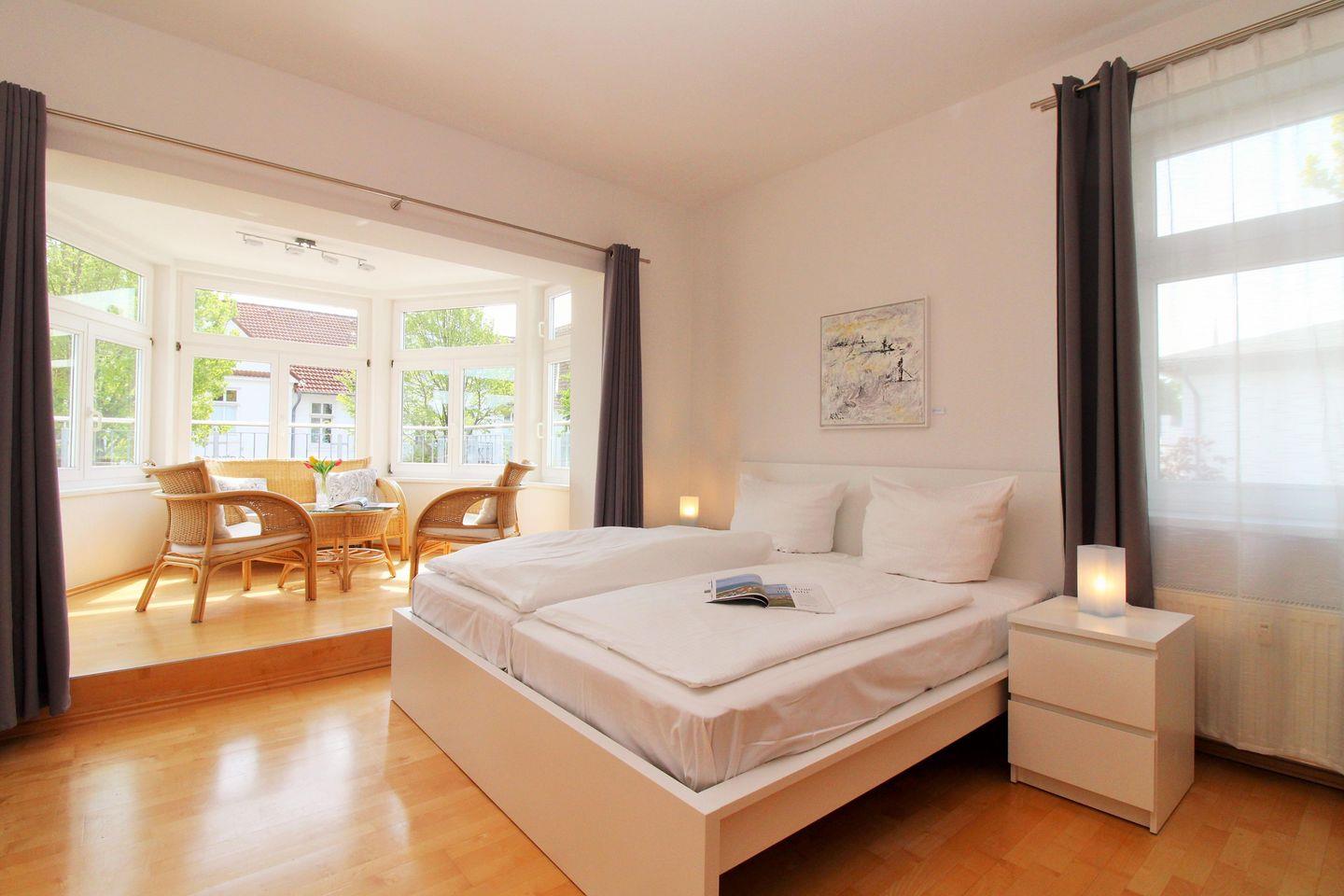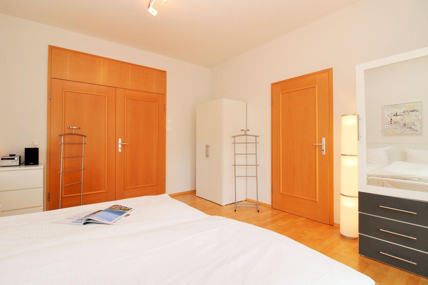 Das moderne und lichtdurchflutete 1. Schlafzimmer ist mit einem bequemen Doppelbett (2 x 90 cm x 200 cm), Nachttischen mit Nachttischlampen, 2 geräumigen Kleiderschränken sowie einer Kommode eingerichtet. Besonders hervorzuheben ist in diesem Raum eine separate und in einem Erker räumlich etwas abgetrennte gemütliche Sitzgruppe mit bequemen Korbmöbeln. Zu Ihrer Unterhaltung steht Ihnen hier ebenfalls eine Stereoanlage mit Radio und CD-Player zur Verfügung.