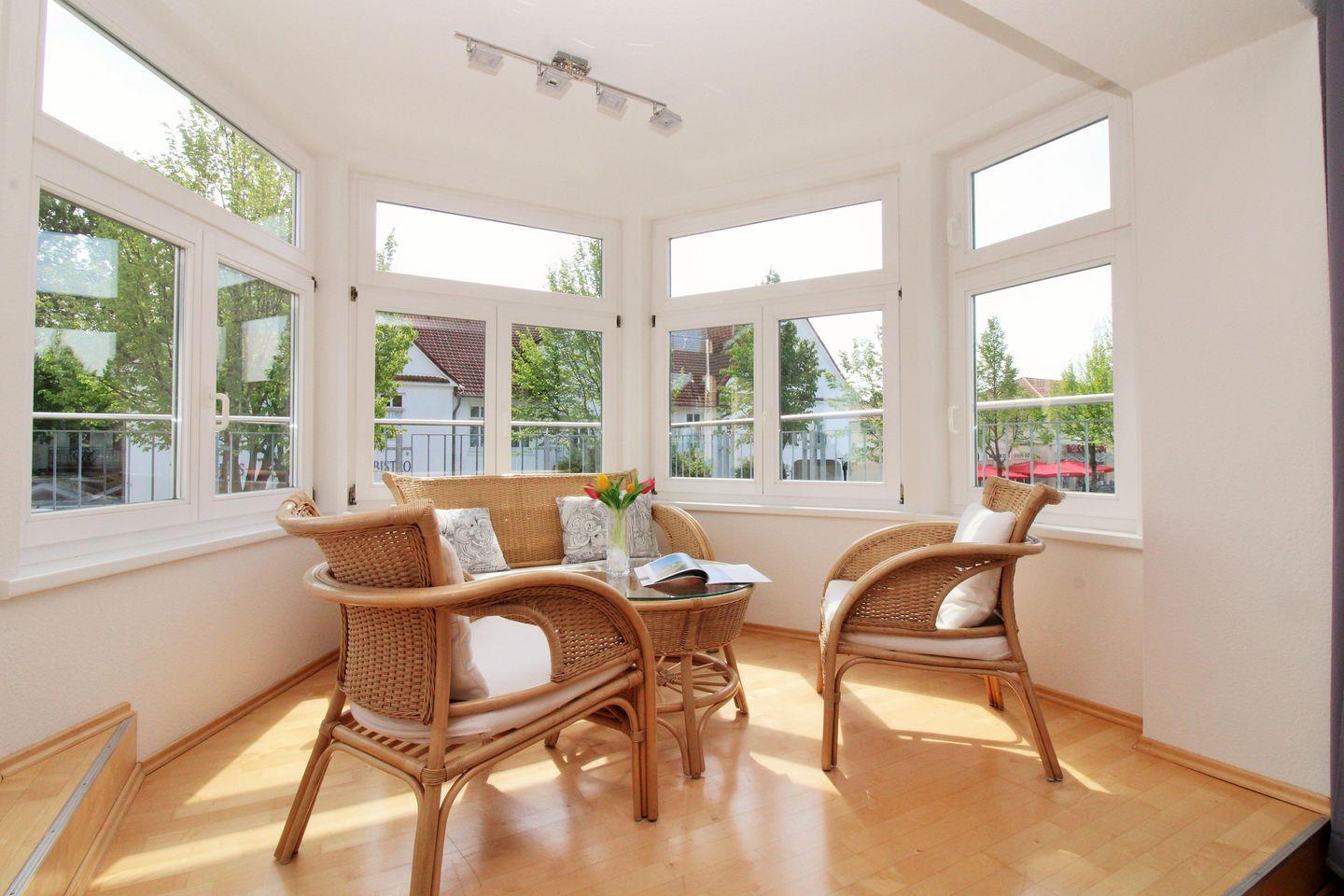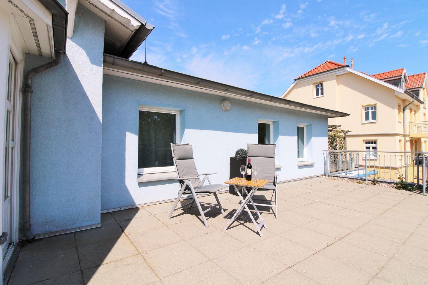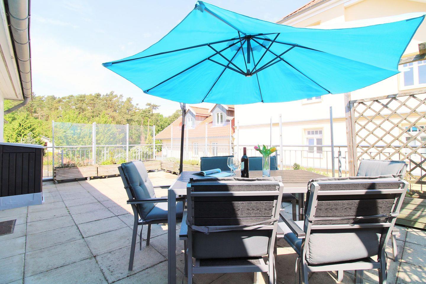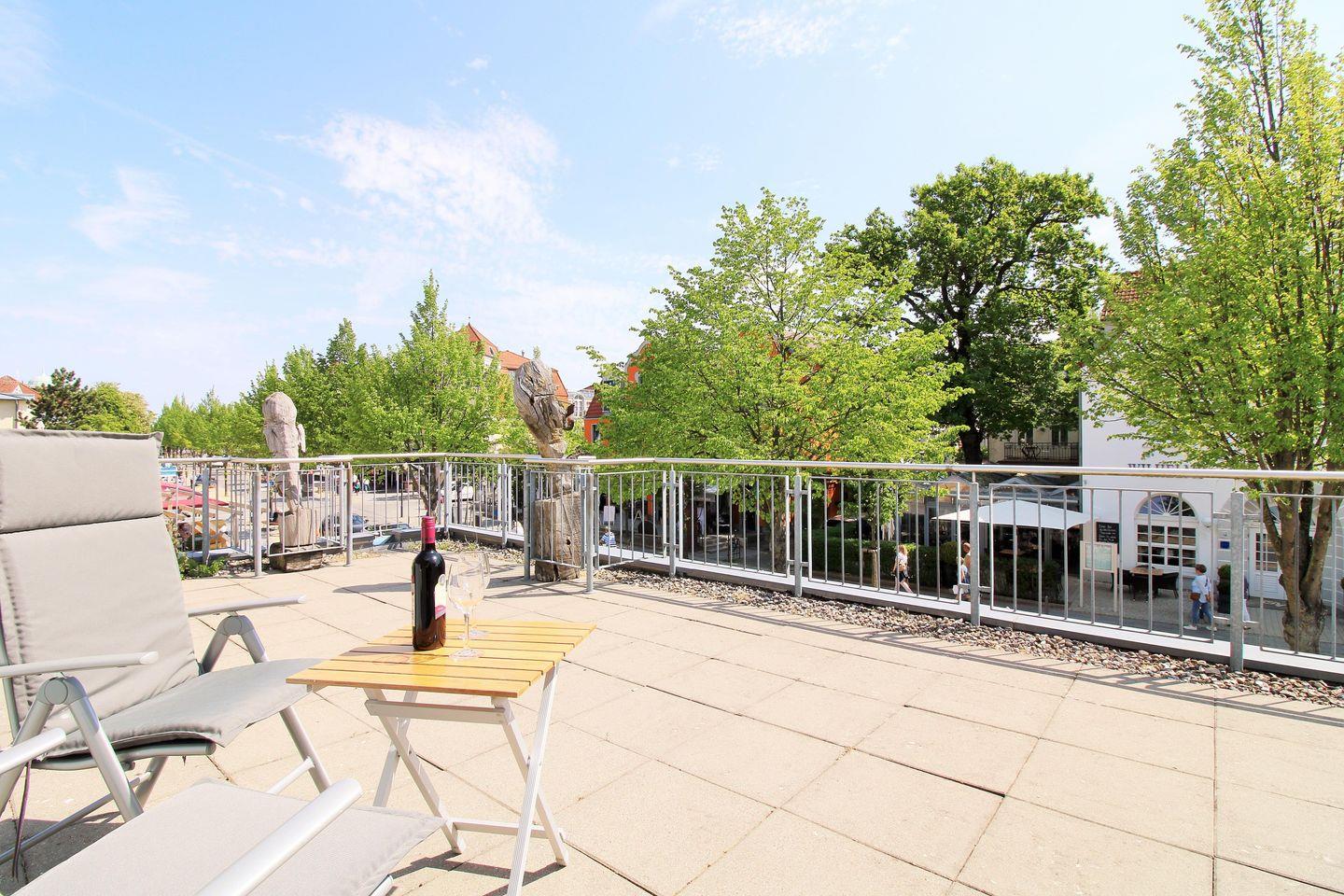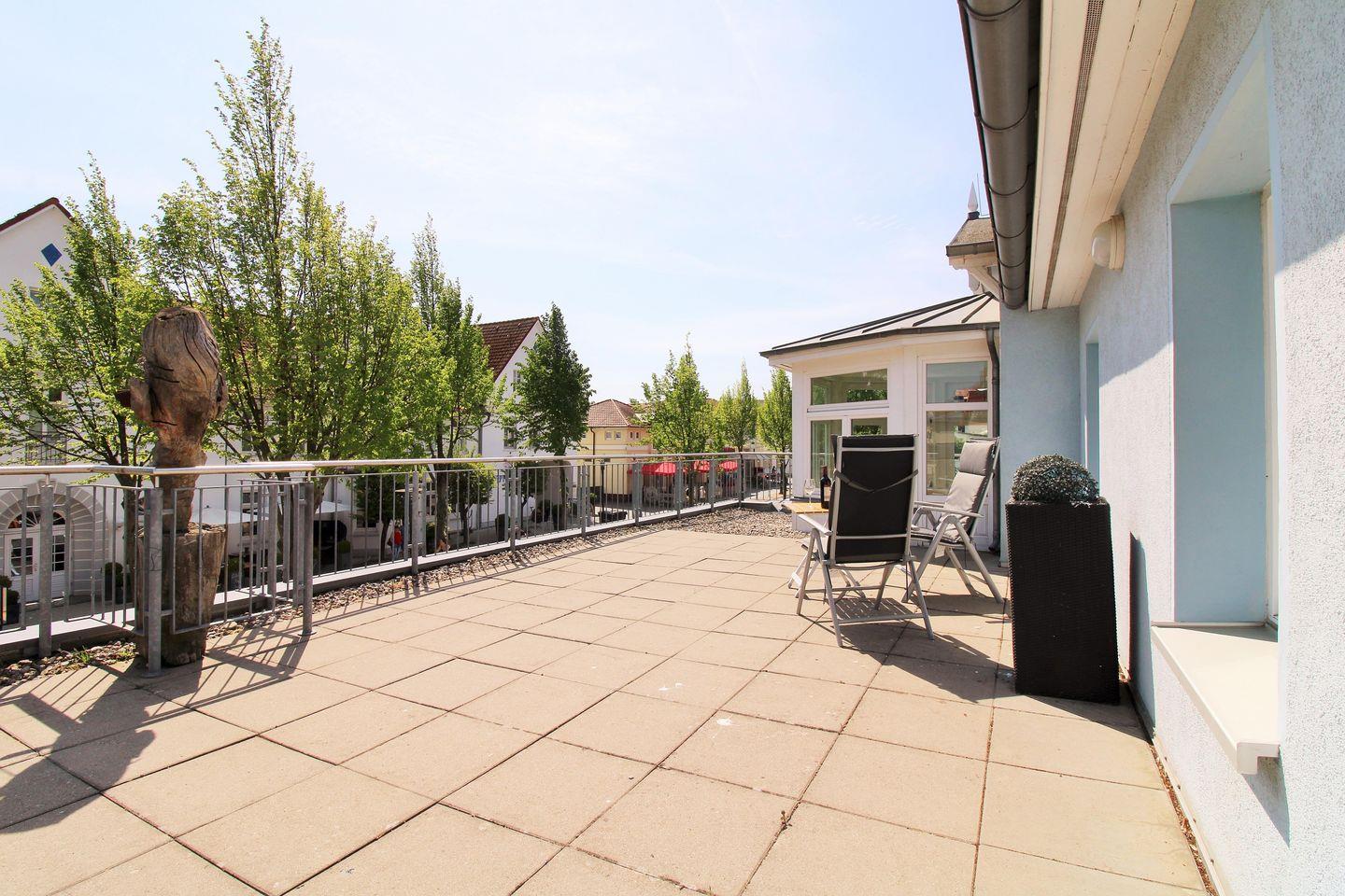 Von diesem Zimmer aus haben Sie Zugang zu einer zweiten, ebenfalls ca. 40 m² großen und sonnigen Dachterrasse mit Balkonmöbeln. Hier sitzen Sie entspannt und gemütlich und können das muntere Treiben auf der Strandstraße verfolgen.