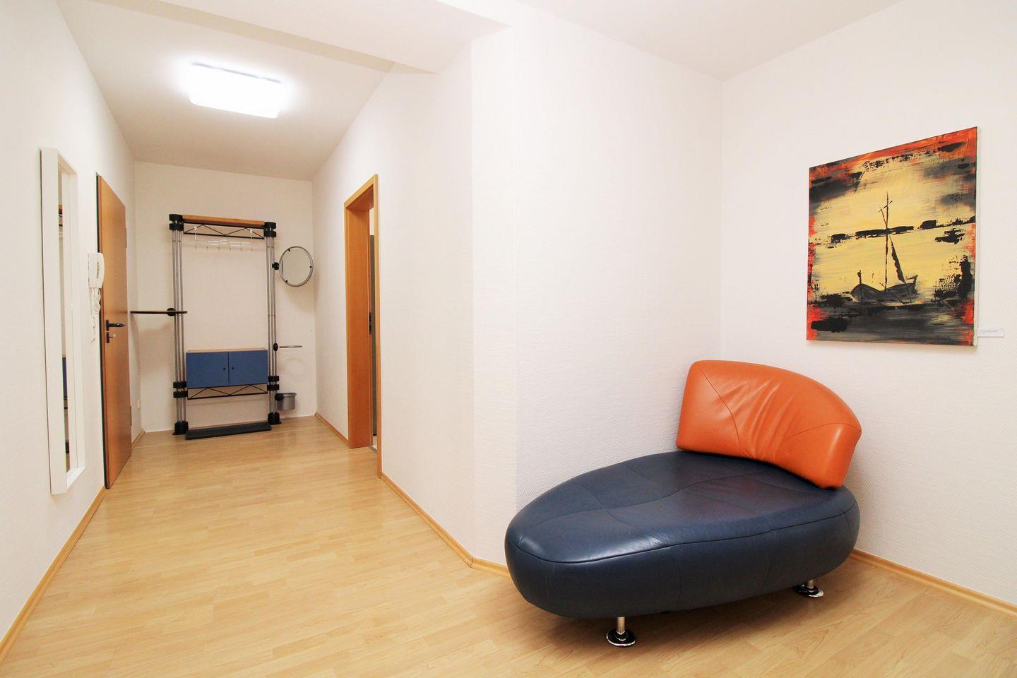 Von der geräumigen Diele im Eingangsbereich mit Garderobe, Sitzmöglichkeit und großem Wandspiegel erreichen Sie bequem alle Räume Ihrer Ferienwohnung.