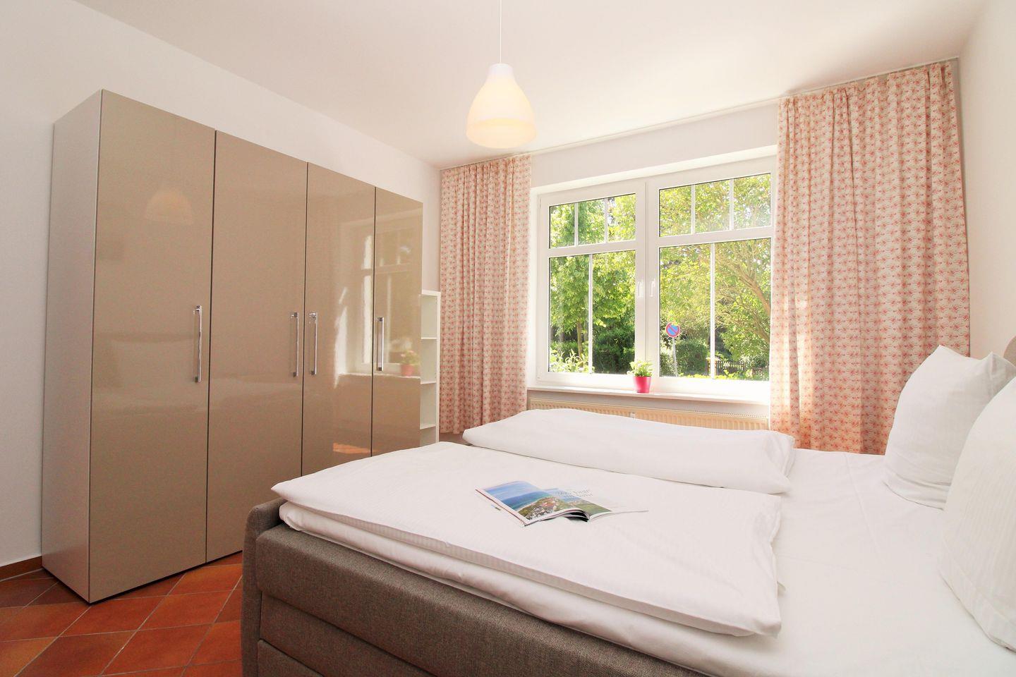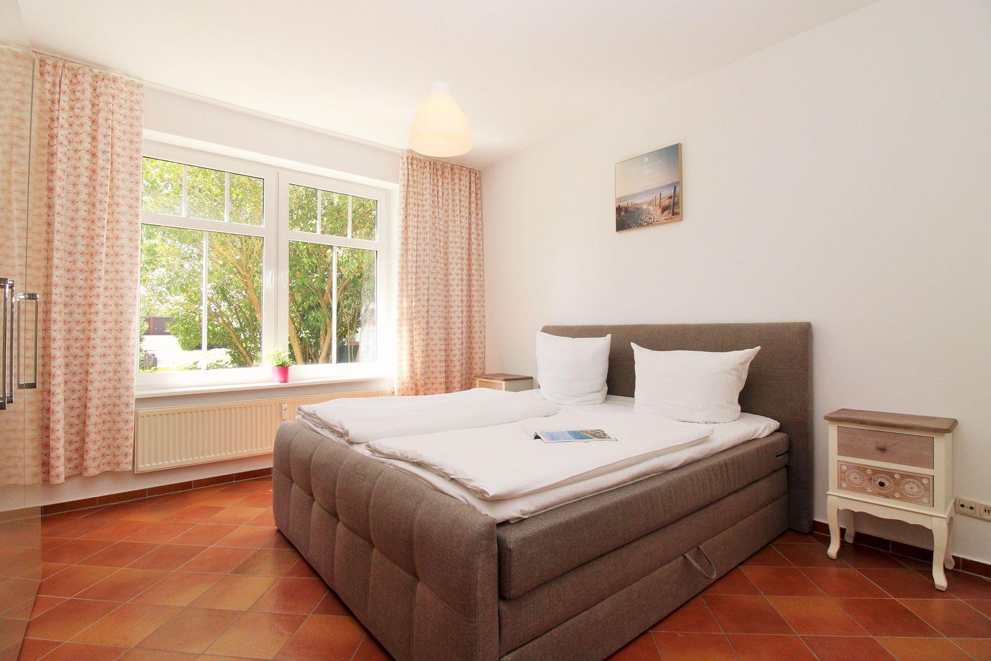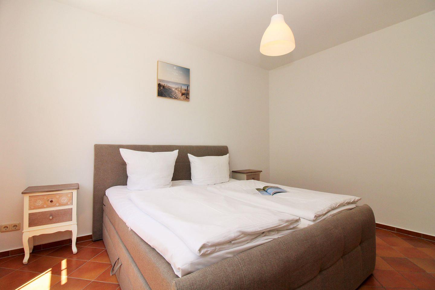Das geräumige Schlafzimmer ist mit einem bequemen Boxspringbett, Nachttischen, einem geräumigen Kleiderschrank sowie einem Regal eingerichtet. Eine zusätzliche bequeme Schlafmöglichkeit für eine weitere 3. und 4. Person bietet die ausziehbare Schlafcouch im Wohnzimmer.