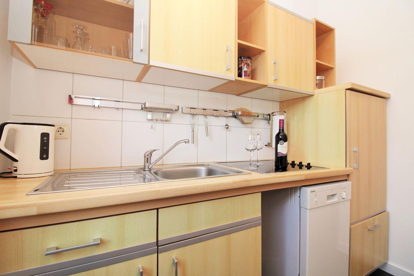 Die separate Küche beinhaltet eine voll ausgestattete Einbauküchenzeile mit 4-Platten-Ceran-Kochfeld, Backofen, Mikrowelle, Kühlschrank mit Gefrierfach, Geschirrspülmaschine, Kaffeemaschine, Wasserkocher und Toaster. Die Küche ist mit Geschirr, Gläsern, Besteck und Töpfen bestens und vollständig ausgestattet.