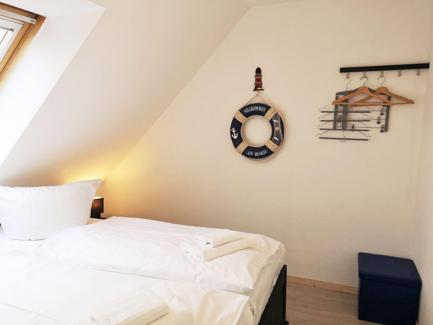 Das helle Schlafzimmer ist mit einem bequemen Doppelbett mit Nachttischen eingerichtet. Für Ihre Urlaubsgarderobe steht Ihnen ein großer begehbarer Kleiderschrank im Eingangsbereich zur Verfügung. Eine zusätzliche bequeme Schlafmöglichkeit mit gutem Schlafkomfort für weitere 2 Personen bietet die ausziehbare Schlafcouch im Wohnzimmer.