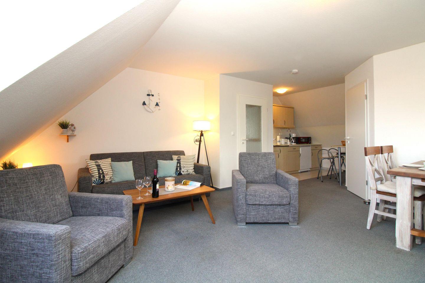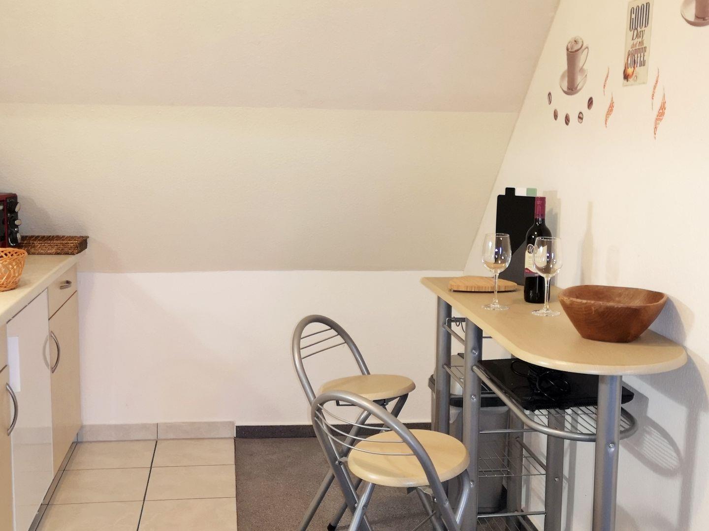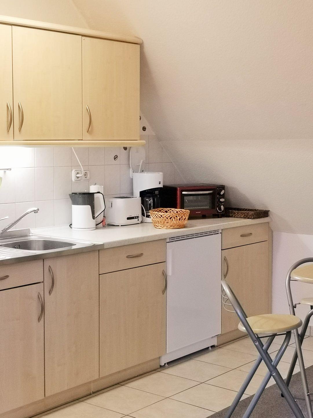Die angrenzende offene Küche beinhaltet eine voll ausgestattete Einbauküchenzeile mit 2-Platten-Herd, Induktionskochplatte, Mini-Backofen, Kühlschrank mit Gefrierfach, Kaffeemaschine, Wasserkocher und Toaster. Die Küche ist mit Geschirr, Gläsern, Besteck und Töpfen bestens und ausreichend ausgestattet.