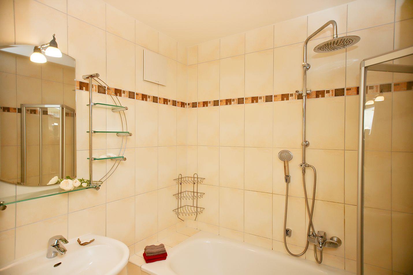 Das freundliche Badezimmer verfügt über eine Badewanne mit Duschabtrennung, Waschbecken, einen Handtuch-Heizkörper sowie ausreichend Ablagemöglichkeiten. Das separate WC erreichen Sie vom Flur.