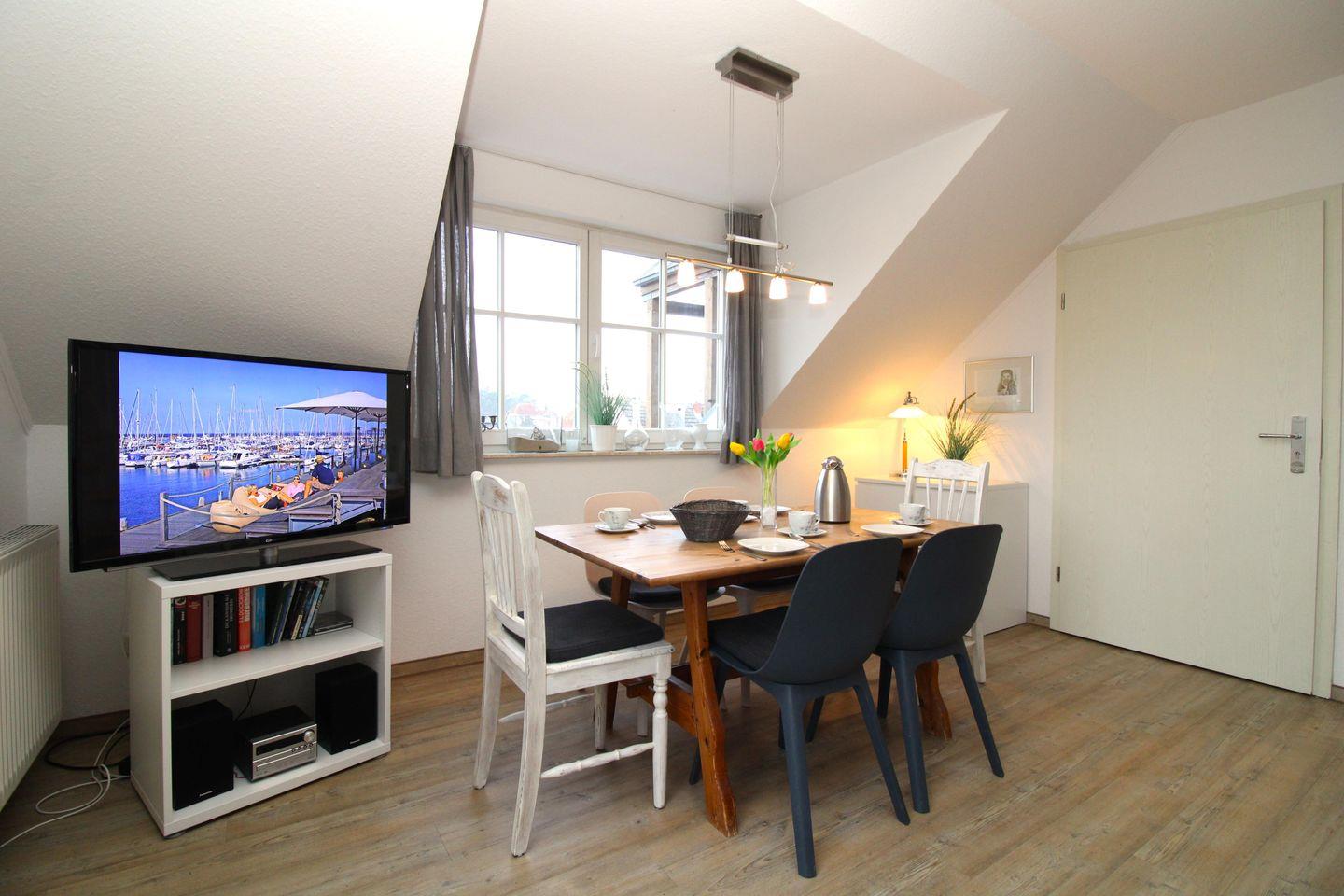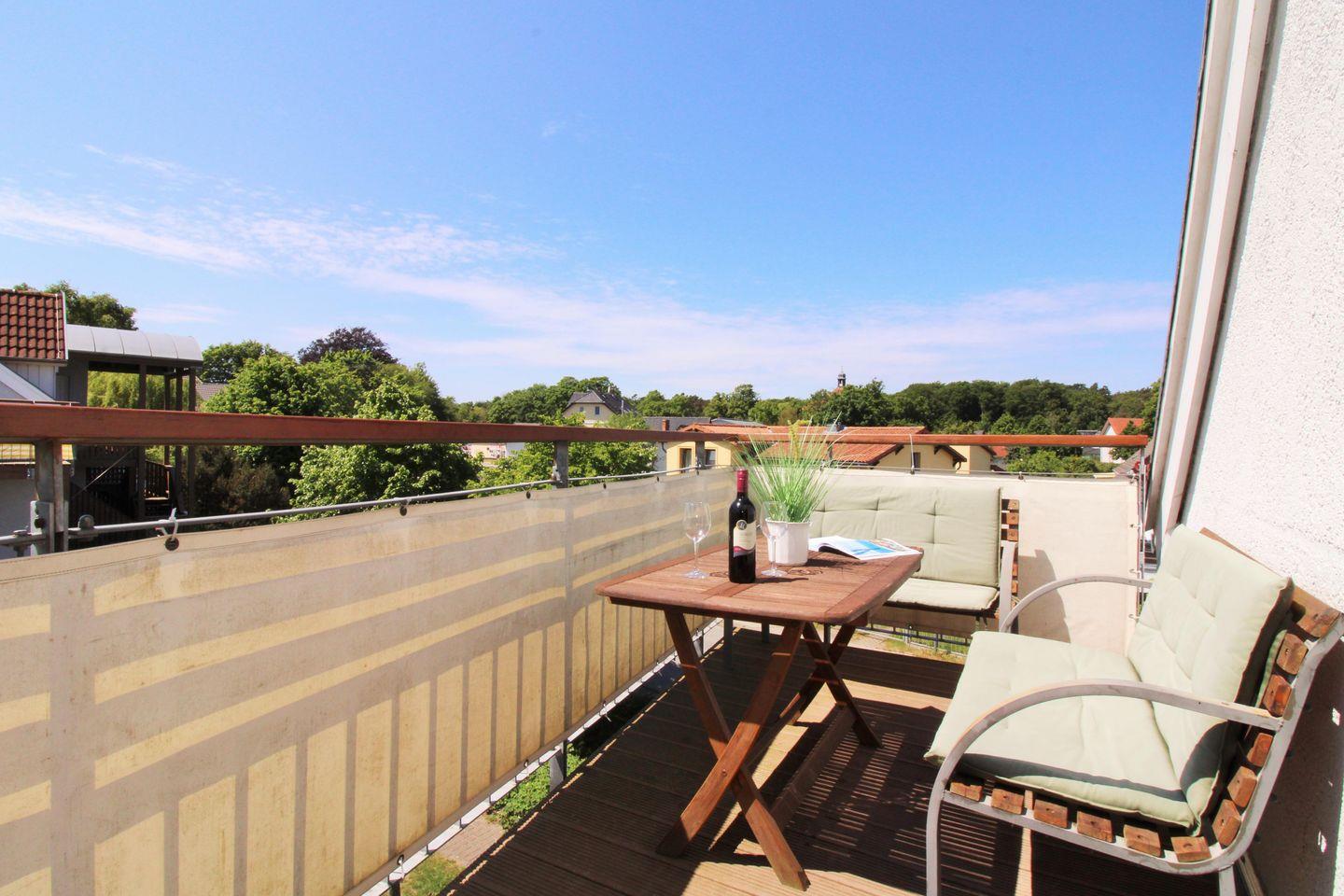 Das helle und freundliche Wohn-/Esszimmer verfügt über eine separate Sitzgruppe mit bequemer Couch und Couchtisch, einen separaten Esstisch mit 6 Stühlen sowie eine Kommode. Vom Wohnzimmer aus haben Sie direkten Zugang zu dem ca. 8 m² großen und sonnigen Balkon (nach Süden und Westen ausgerichtet) mit verschiedenen Balkonmöbeln - hier sitzen Sie entspannt und gemütlich im Grünen und können abends bei einem guten Glas Wein in Ruhe die lauen Sommernächte genießen!