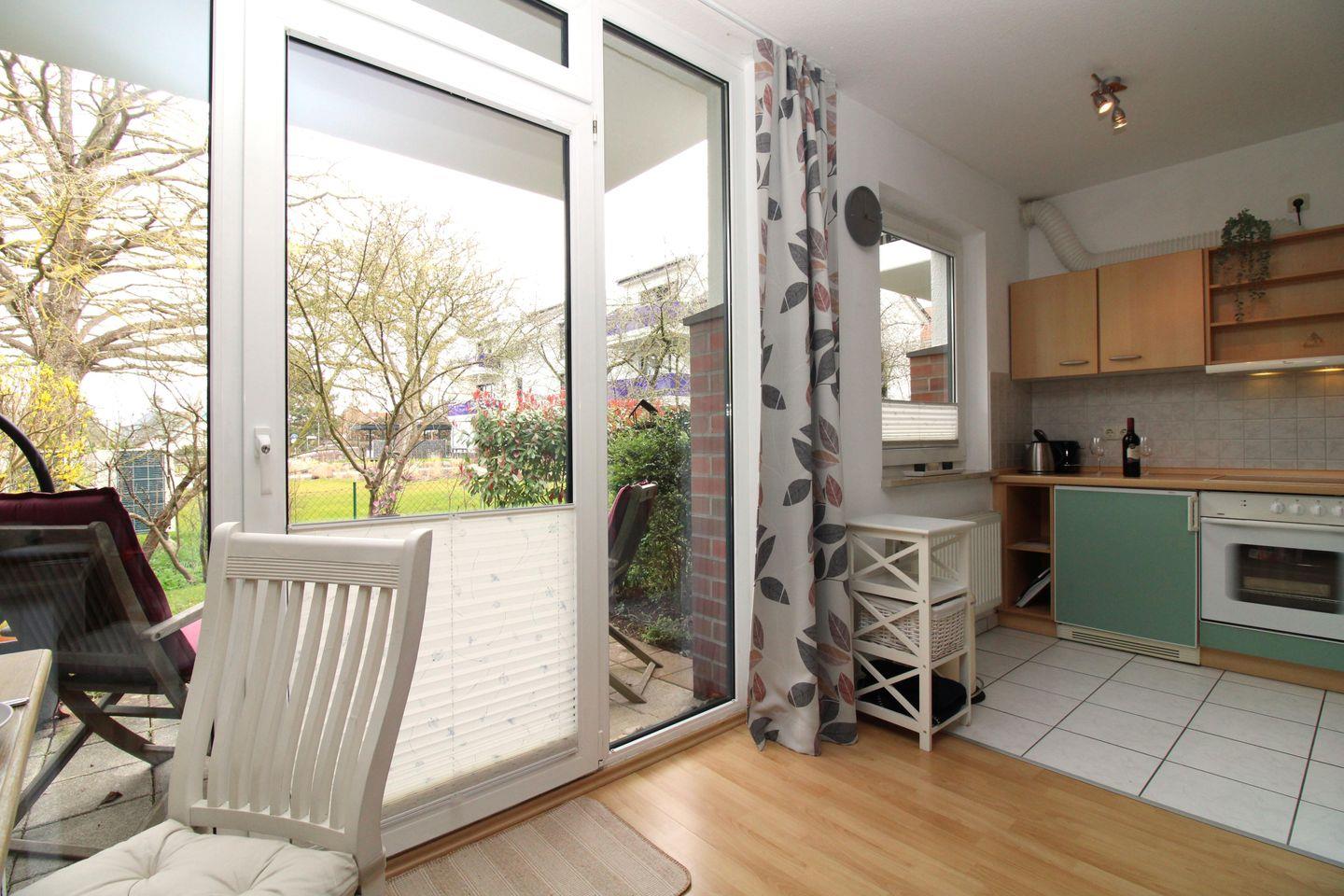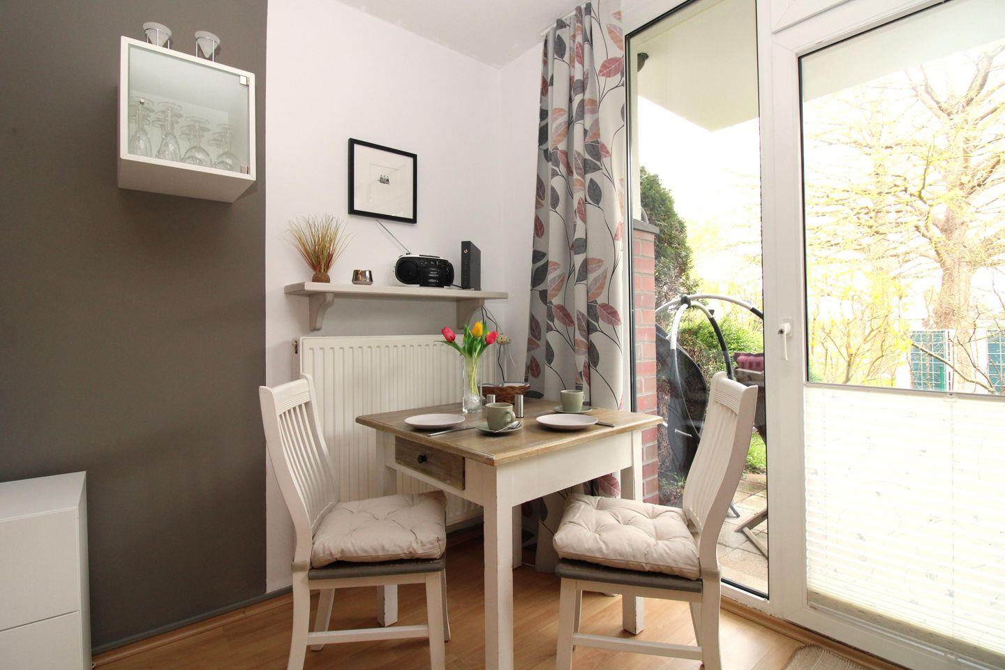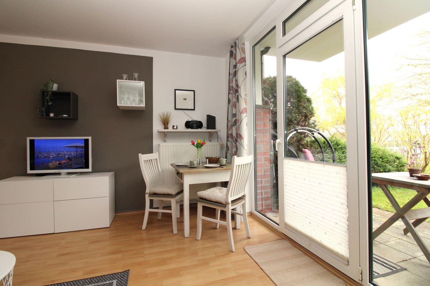Der moderne und gemütliche Wohnbereich verfügt über eine separate Sitzgruppe mit bequemer Couch, Sessel und Couchtisch, eine geräumige Regalwand als Raumteiler zwischen Wohn- und Schlafbereich, ein Sideboard sowie einen Esstisch mit Stühlen. Vom Wohnzimmer aus haben Sie direkten Zugang zu der ca. 5 m² großen Terrasse (nach Nord-Osten ausgerichtet) mit bequemen Sitzmöbeln - hier sitzen Sie entspannt und gemütlich mitten im Grünen und können abends bei einem guten Glas Wein in Ruhe die lauen Sommernächte genießen!