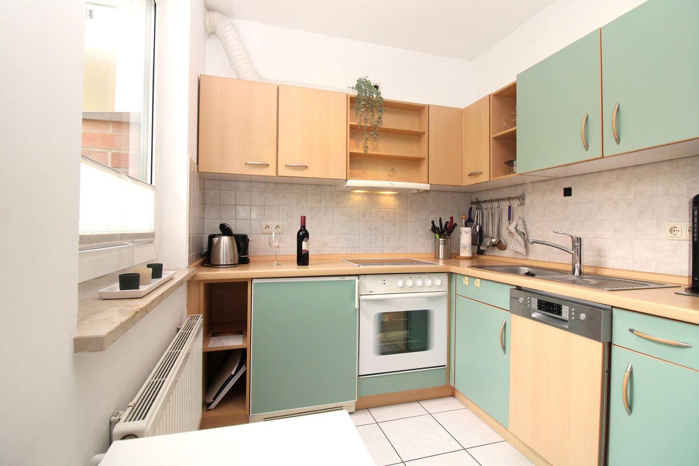 Die offene und komplett ausgestattete Küche verfügt über eine Einbauküchenzeile mit Kühlschrank und Gefrierfach, einen 4-Platten-Ceranfeld-Herd, Dunstabzug, Backofen, Geschirrspüler sowie Kaffeemaschine, Wasserkocher und Toaster. Die Küche ist mit Geschirr, Gläsern, Besteck und Töpfen komplett ausgestattet.