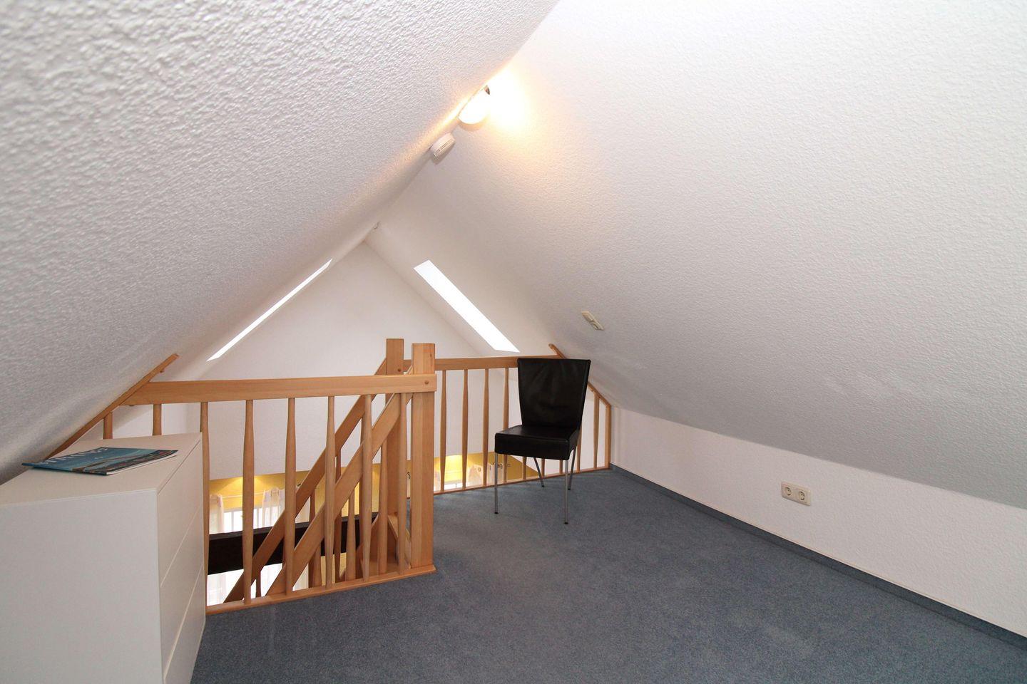 Das sehr gemütliche und über eine kleine Treppe aus dem Wohnzimmer erreichbare 2. Schlafzimmer in der Galerie (OG) der Wohnung verfügt ebenfalls über ein bequemes Doppelbett, Nachttische sowie einen Kommode.