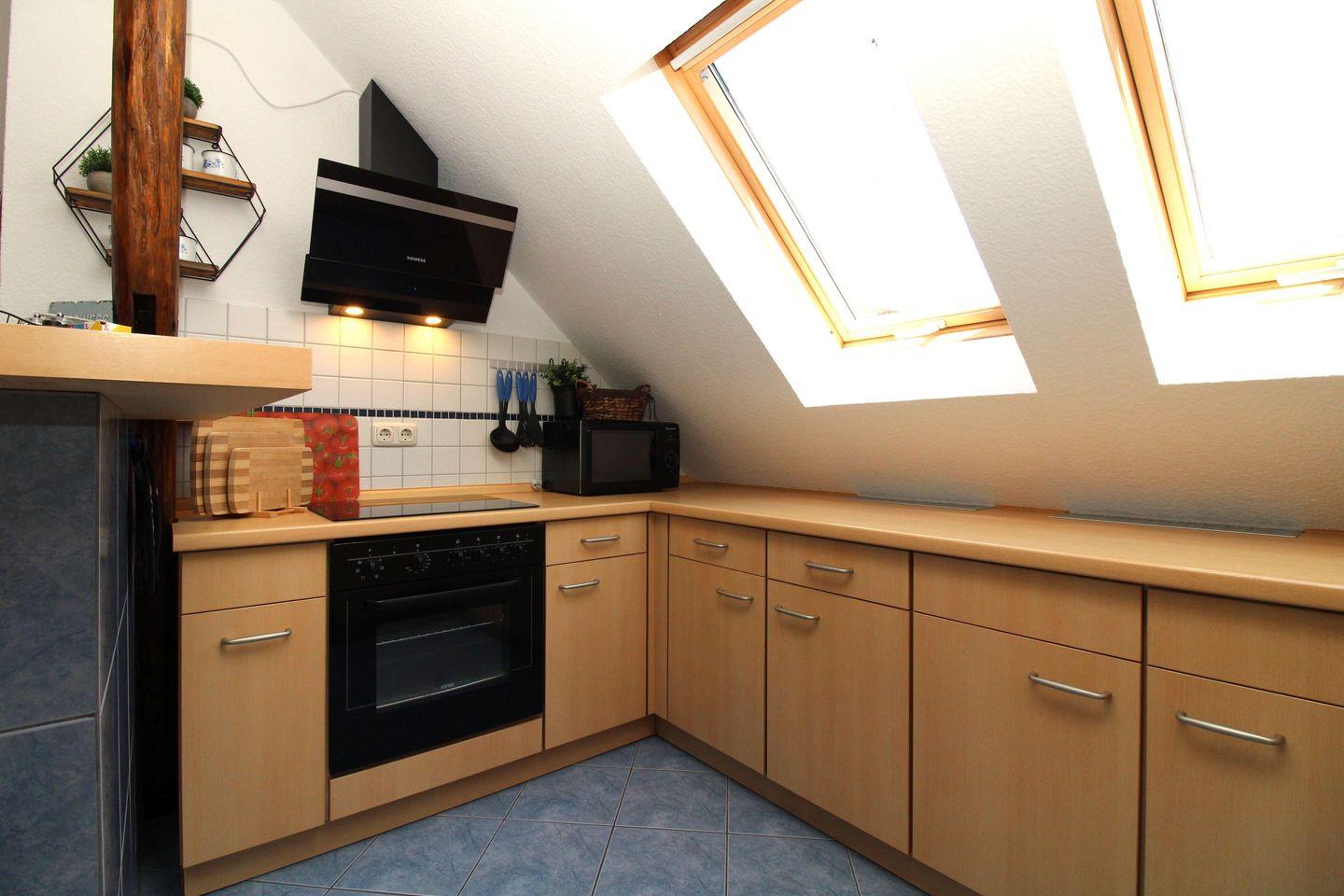 Die halb offene Küche beinhaltet eine voll ausgestattete Einbauküchenzeile mit 4-Platten-Ceran-Kochfeld, Backofen, Dunstabzug, Mikrowelle, Kühlschrank mit Gefrierfach, Geschirrspülmaschine, Kaffeemaschine, Wasserkocher und Toaster. Die Küche ist mit Geschirr, Gläsern, Besteck und Töpfen vollständig ausgestattet. Ein Tresen mit 4 Barhockern bietet sich für die kleine Mahlzeit zwischendurch an.
