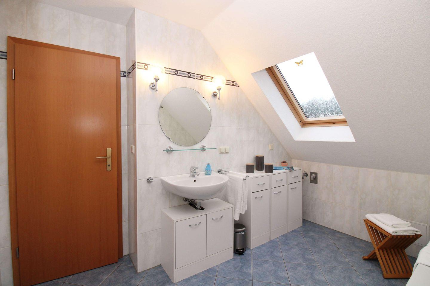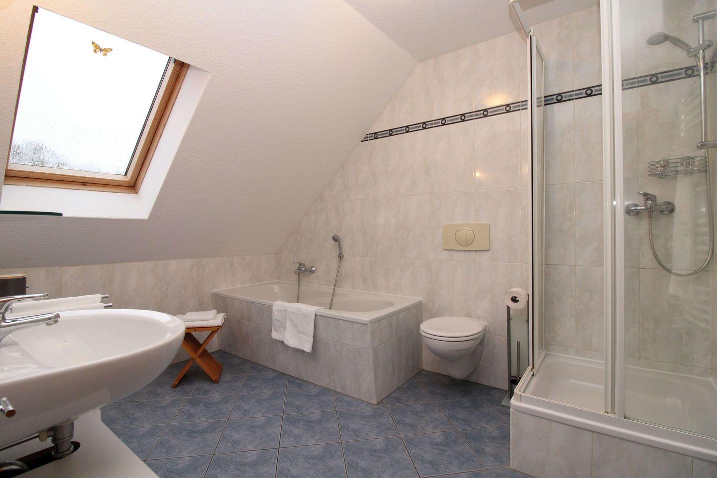 Das helle und geräumige Badezimmer (mit Tageslicht / Fenster) verfügt über eine Dusche sowie zusätzlich eine Badewanne, Waschbecken und WC, einen Handtuch-Heizkörper, einen Waschtisch-Unterschrank sowie eine kleine Kommode und bietet ausreichend Ablagemöglichkeiten.