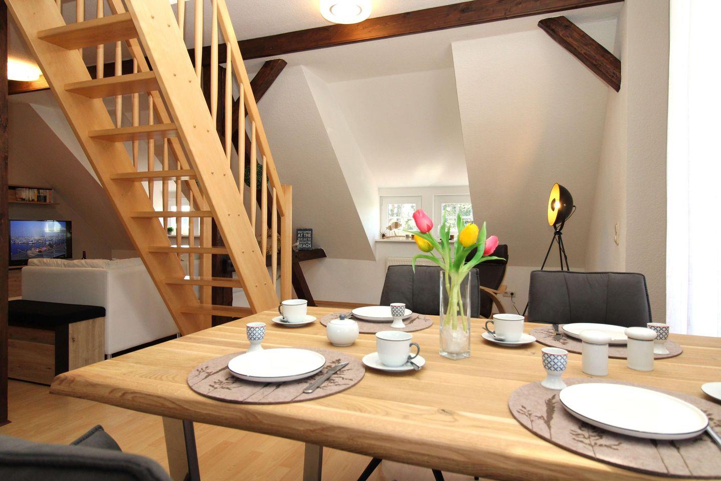 Das großzügige und gemütliche Wohn-/Esszimmer verfügt über eine separate Sitzgruppe mit bequemer und großer Leder-Eckcouch und Couchtisch, eine gemütliche Leseecke mit Freischwinger-Sessel, einen separaten Esstisch mit 4 Stühlen, ein Sideboard sowie 1 großen Schrank. Vom Wohn-/Esszimmer aus haben Sie direkten Zugang zu dem kleinen Balkon (nach Süd-Westen ausgerichtet) mit 2 Stühlen und Balkontisch. Hier sitzen Sie entspannt und gemütlich mit Blick ins Grüne und können abends bei einem guten Glas Wein in Ruhe die lauen Sommernächte genießen!