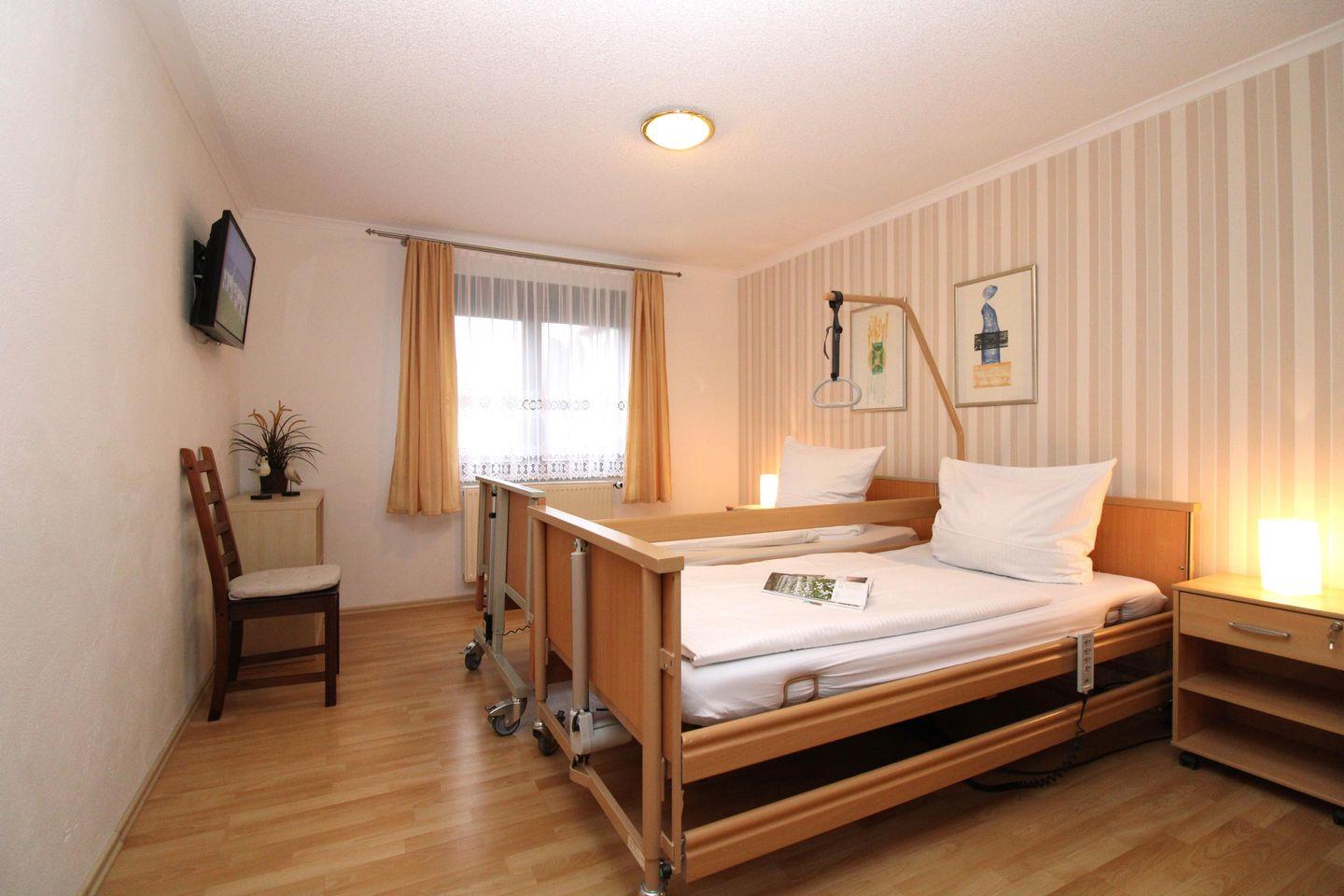 Das helle und geräumige 1. Schlafzimmer ist mit zwei bequemen und elektrisch verstellbaren Pflegebetten, Nachttischen, einem geräumigen Kleiderschrank, einem offenen Sideboard / Regal sowie zwei Stühlen eingerichtet. Darüber hinaus steht Ihnen in diesem Zimmer ein weiteres TV-Gerät zur Verfügung.