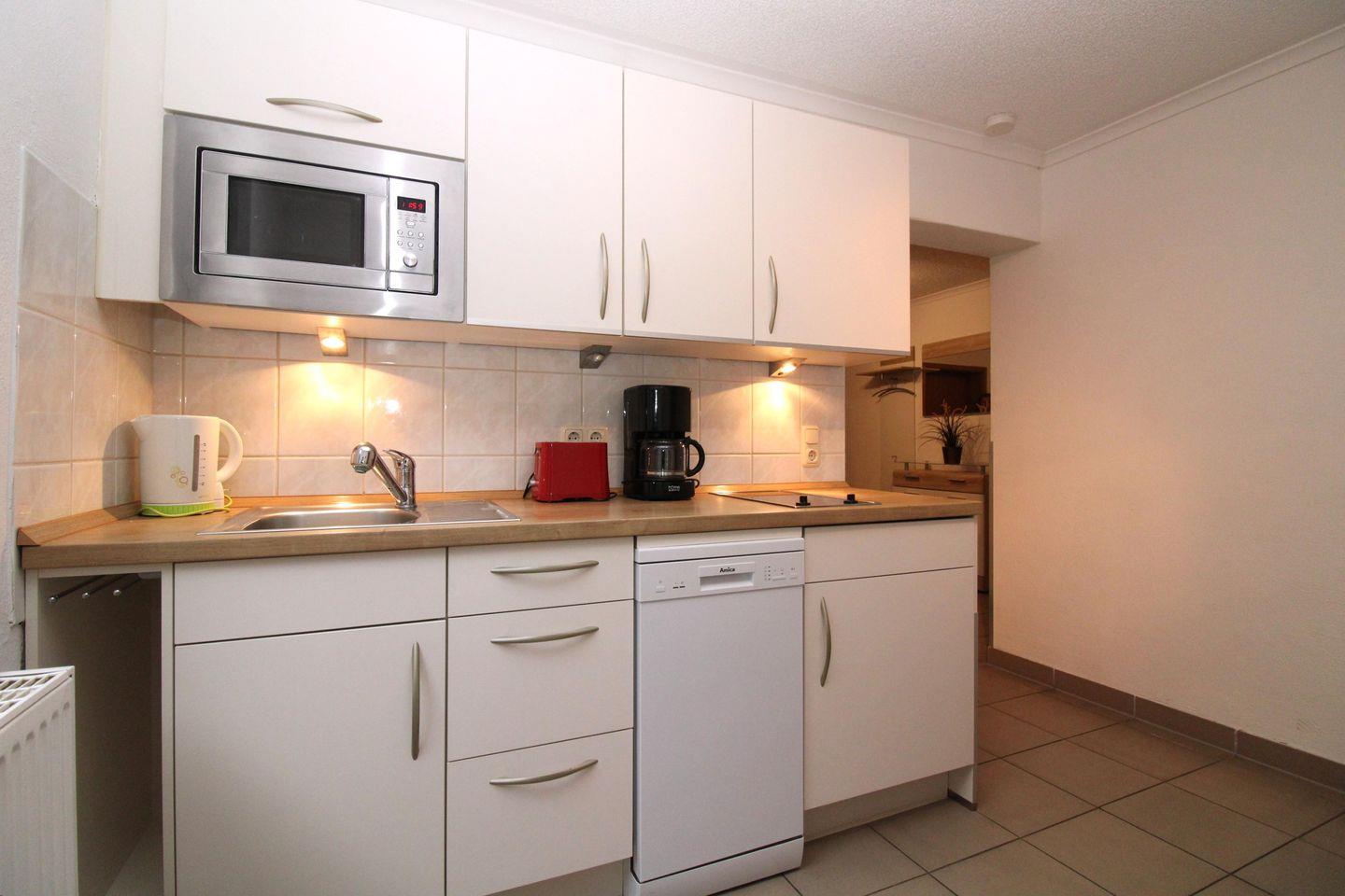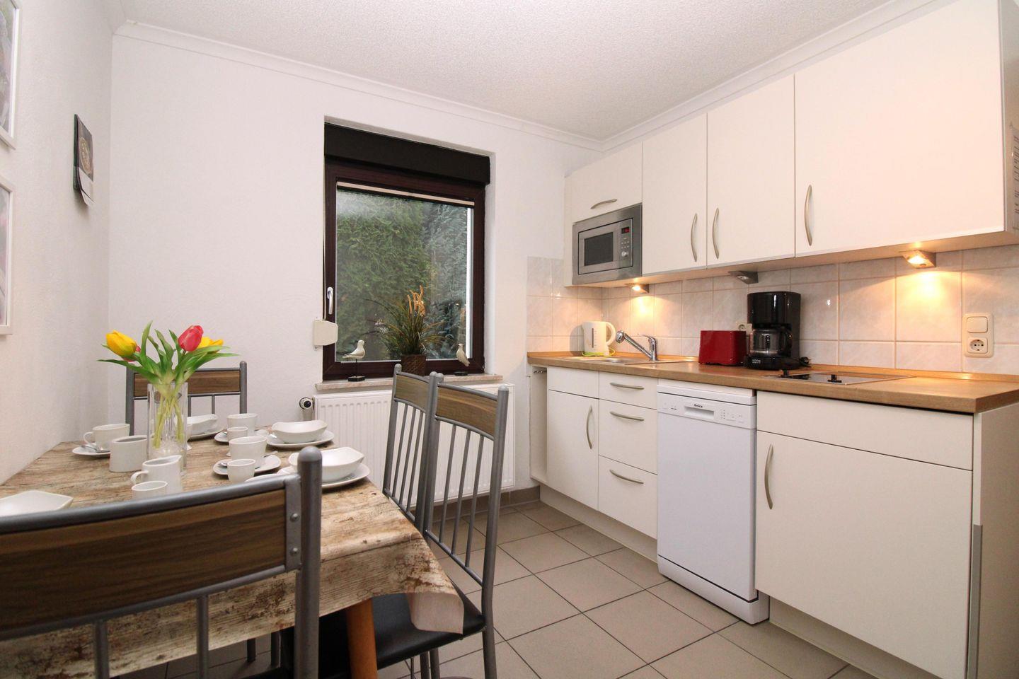 Der separate Küchen- und Essbereich beinhaltet eine voll ausgestattete Einbauküchenzeile mit 2-Zonen-Ceran-Kochfeld, Mikrowelle, Kühlschrank, Geschirrspülmaschine, Kaffeemaschine, Wasserkocher, Toaster sowie einen Esstisch mit Stühlen. Die Küche ist mit Geschirr, Gläsern, Besteck und Töpfen vollständig ausgestattet.
