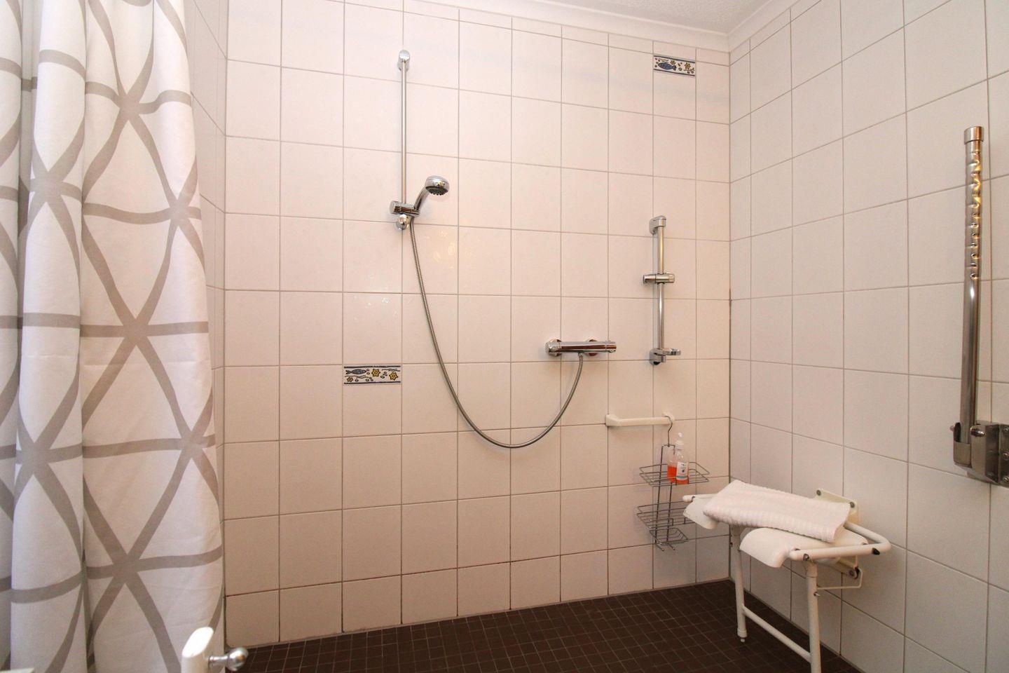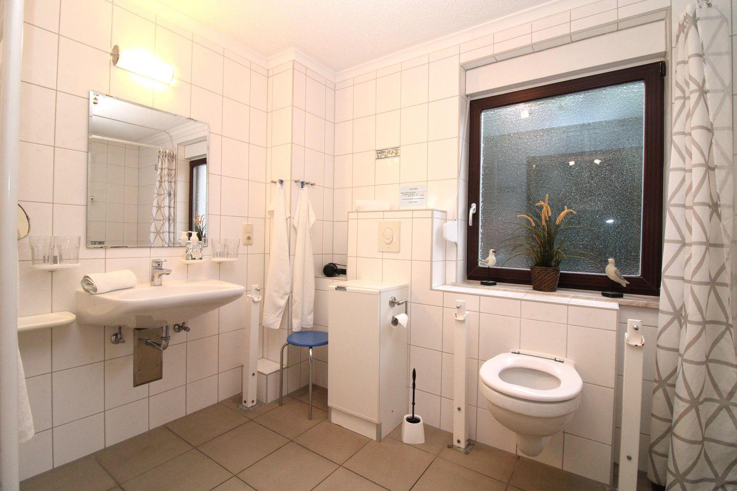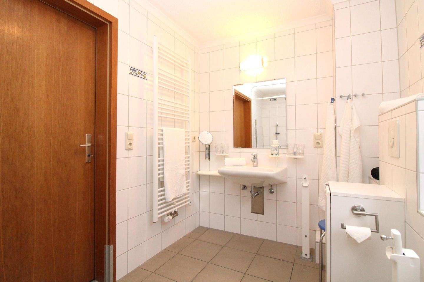 Das rollstuhlgerechte und sehr geräumige Badezimmer (mit Tageslicht / Fenster) verfügt über eine bodenebene befahrbare Dusche mit klappbarem Duschsitz, WC, Waschbecken, Badezimmerschrank, Handtuchheizkörper, Kosmetikspiegel, Föhn sowie ausreichend Ablagemöglichkeiten.