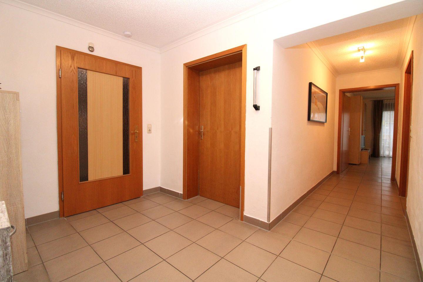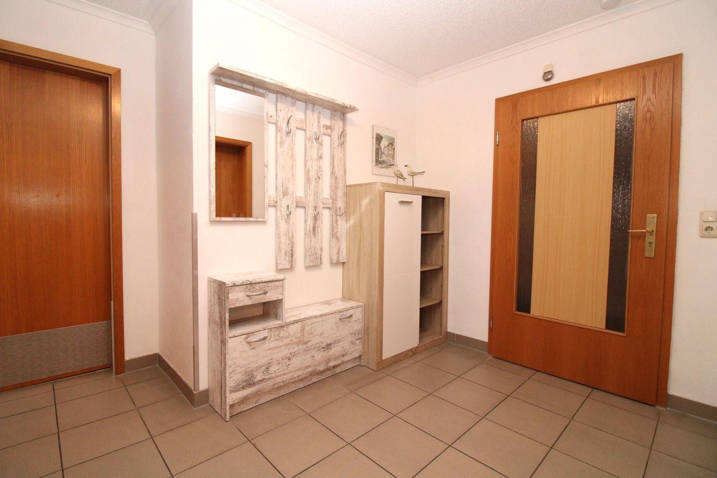 Von der geräumigen Diele mit großer Garderobe, Spiegel, Schuhschrank und Sideboard erreichen Sie bequem alle Räume Ihrer Ferienwohnung.