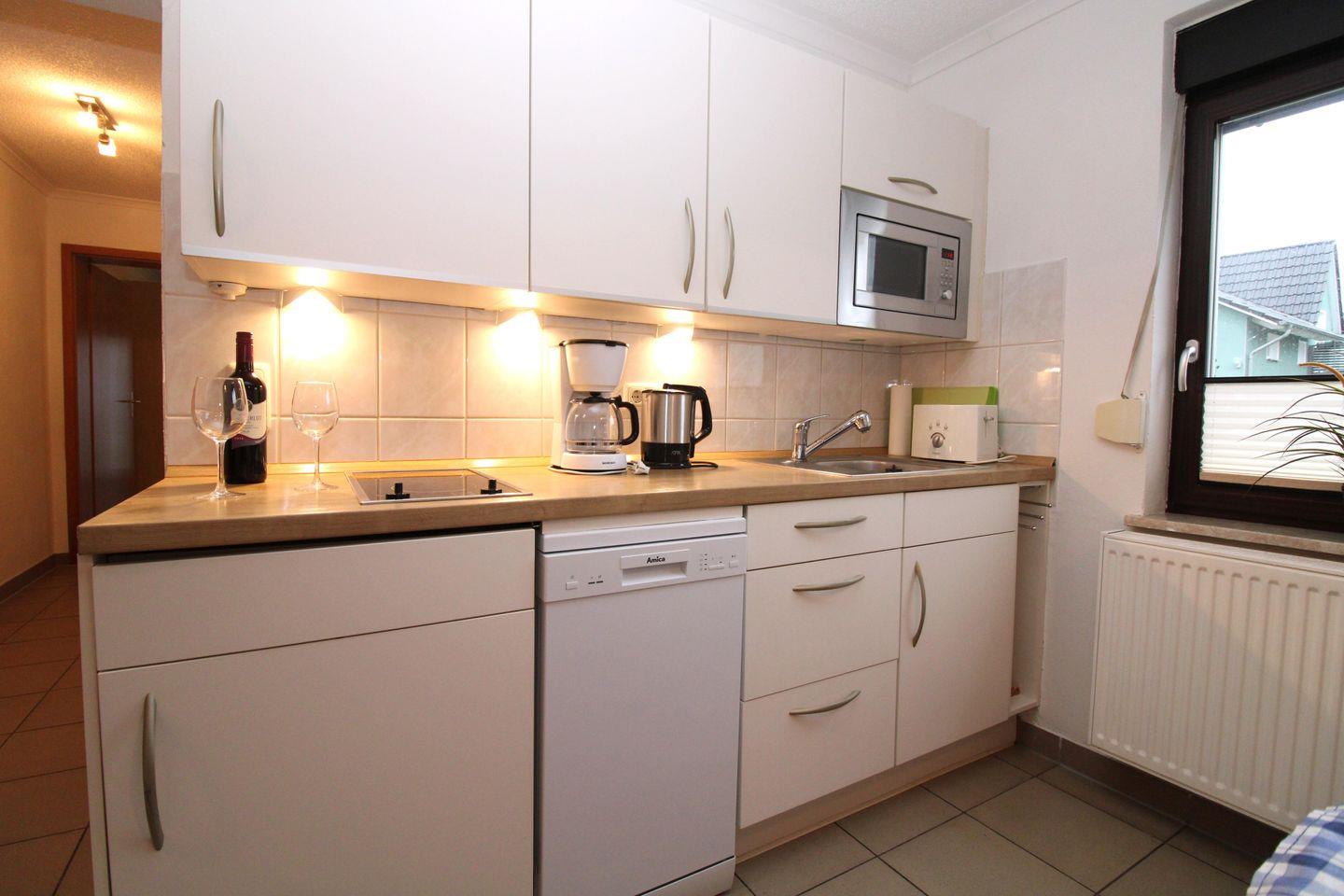 Der separate Küchen- und Essbereich beinhaltet eine voll ausgestattete Einbauküchenzeile mit 2-Zonen-Ceran-Kochfeld, Mikrowelle, Kühlschrank, Geschirrspülmaschine, Wasserkocher, Kaffeemaschine, Toaster sowie einen Esstisch mit 4 Stühlen. Die Küche ist mit Geschirr, Gläsern, Besteck und Töpfen vollständig ausgestattet.