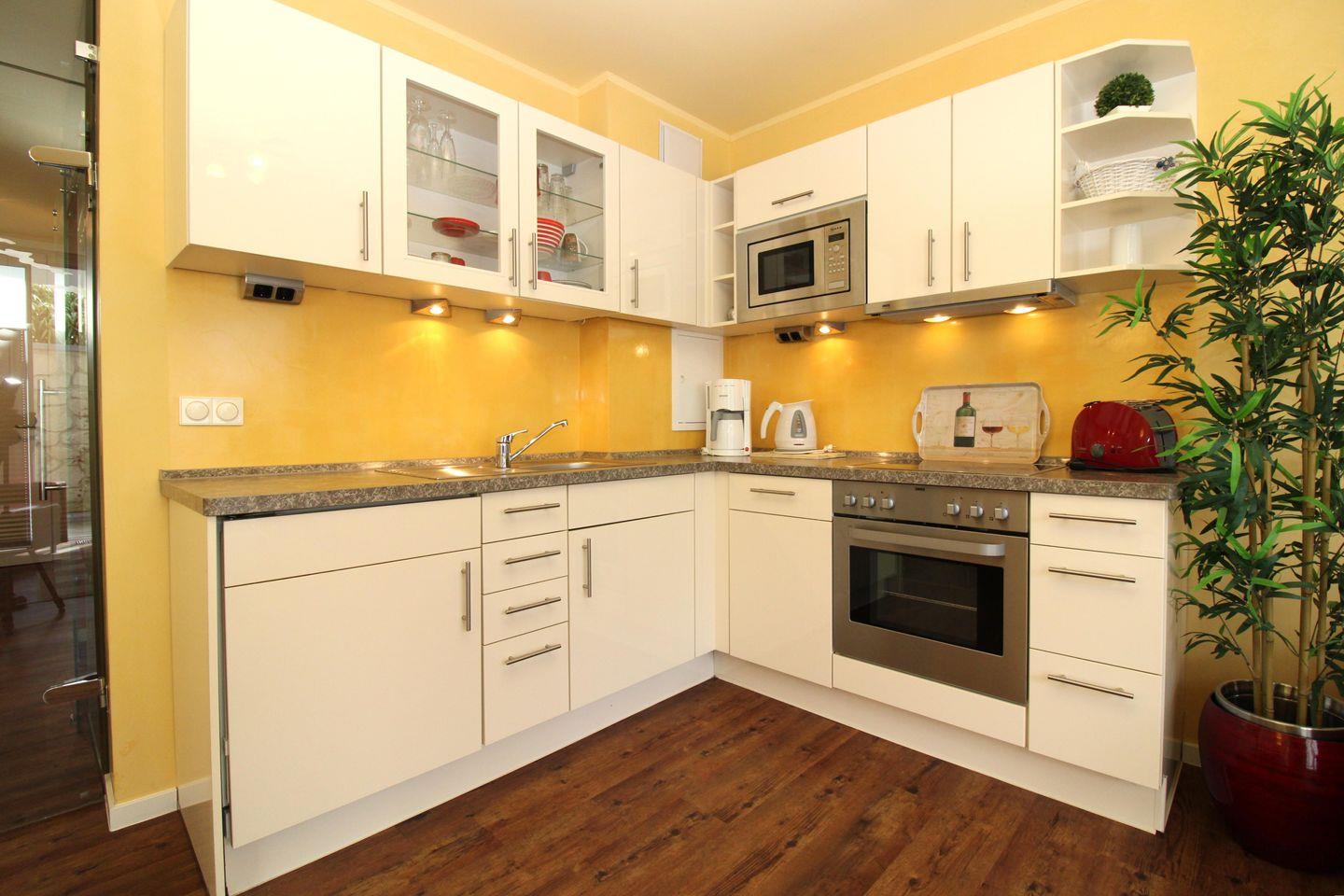 Die offene und moderne Küche beinhaltet eine voll ausgestattete Einbauküchenzeile in gehobener Ausstattung mit 4-Zonen-Ceran-Kochfeld, Backofen, Dunstabzug, Mikrowelle, Kühlschrank mit Gefrierfach, Geschirrspülmaschine, Kaffeemaschine, Wasserkocher, Eierkocher und Toaster. Die Küche ist mit Geschirr, Gläsern, Besteck und Töpfen komplett ausgestattet.