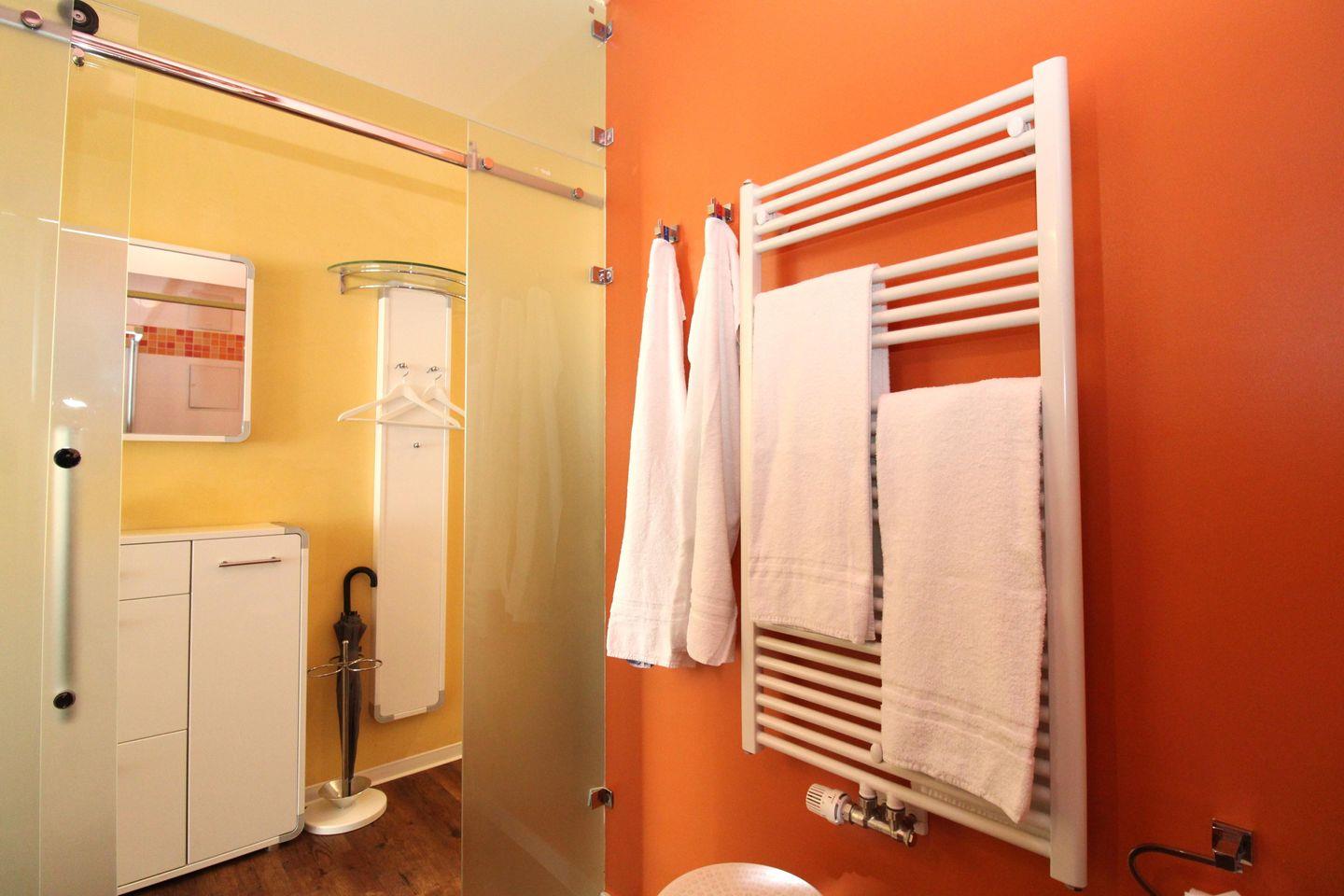 Das exklusive und modern gestaltete Badezimmer verfügt über eine Echtglas-Dusche mit niedrigem Einstieg (seniorenfreundlich!), Waschbecken mit Unter- und Spiegelschrank, Föhn, WC, Handtuch-Heizkörper sowie ausreichend Ablagemöglichkeiten.