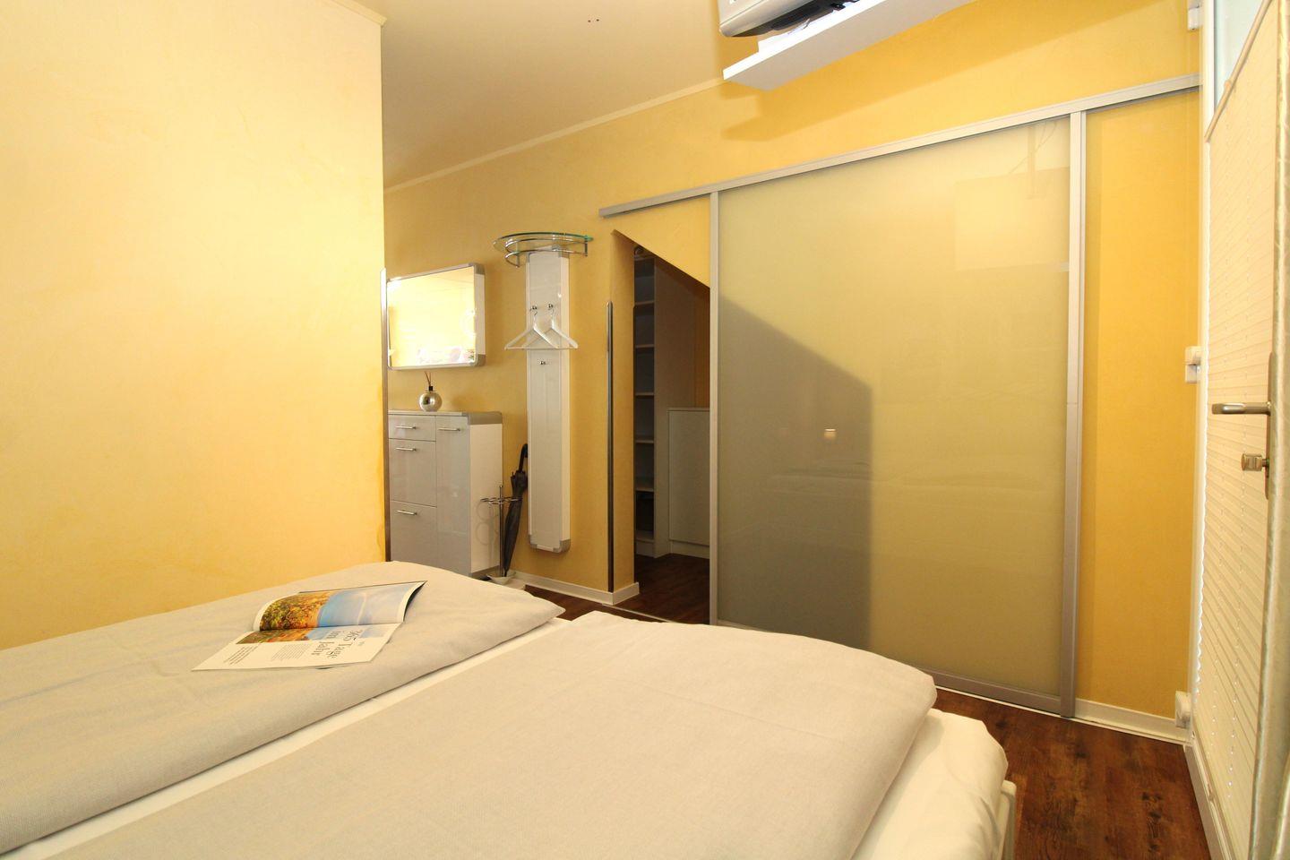 Der gemütliche Schlafbereich ist mit einem bequemen Doppelbett (2 x 80 cm x 200 cm), Nachttischen mit Nachttischlampen sowie einem geräumigen begehbaren Kleiderschrank eingerichtet. Im Schlafzimmer steht Ihnen ebenfalls ein zusätzliches TV-Gerät zur Verfügung.