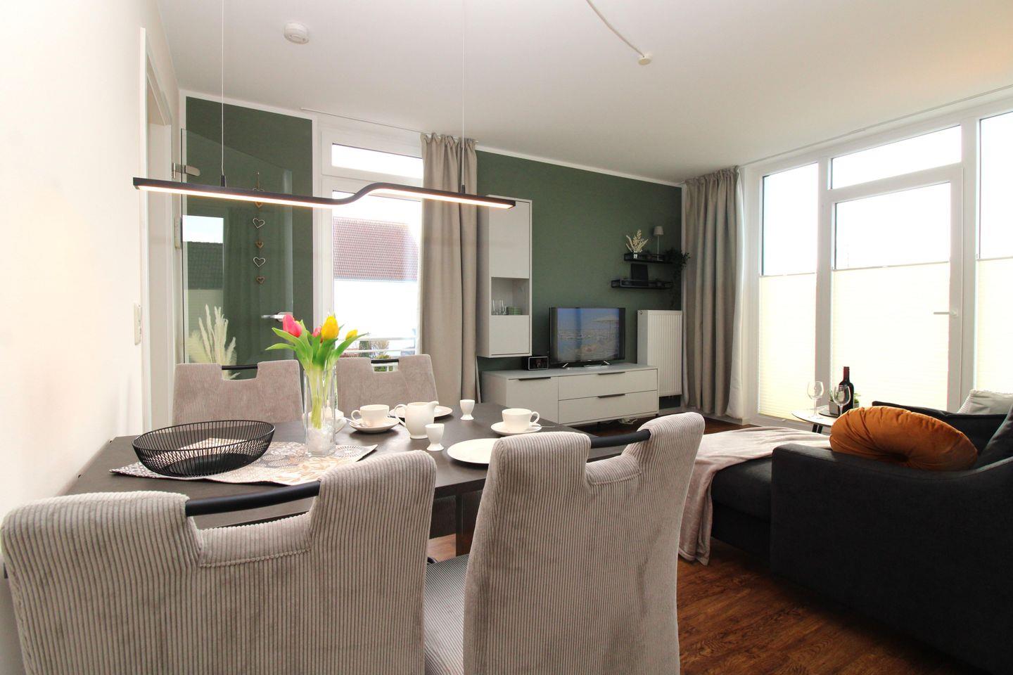Die lichtdurchflutete, freundliche, sehr gut und geschmackvoll eingerichtete 2-Zimmer-Wohnung (ca. 43 m²) befindet sich im 1. Obergeschoss. Die im Frühjahr 2024 komplett renovierte und neu möblierte Wohnung besitzt ein hohes Maß an Wohlfühlkomfort und ist komplett ausgestattet. Der Bodenbelag in den Wohnräumen ist moderner Vinyl-Designbelag, der Eingangsbereich sowie die Küche und das Bad / WC sind gefliest.