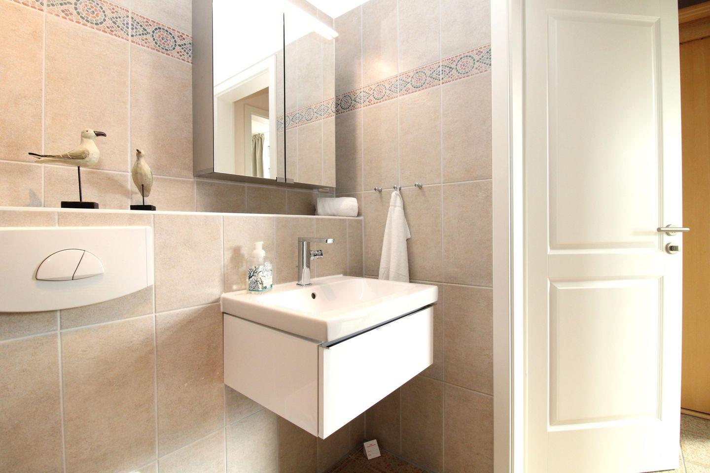 Das freundliche und geräumige Badezimmer verfügt über eine Badewanne mit Echtglas-Duschtrennwand, WC, Waschbecken mit Unter- und Spiegelschrank, Handtuch-Heizkörper sowie ausreichend Ablageflächen.