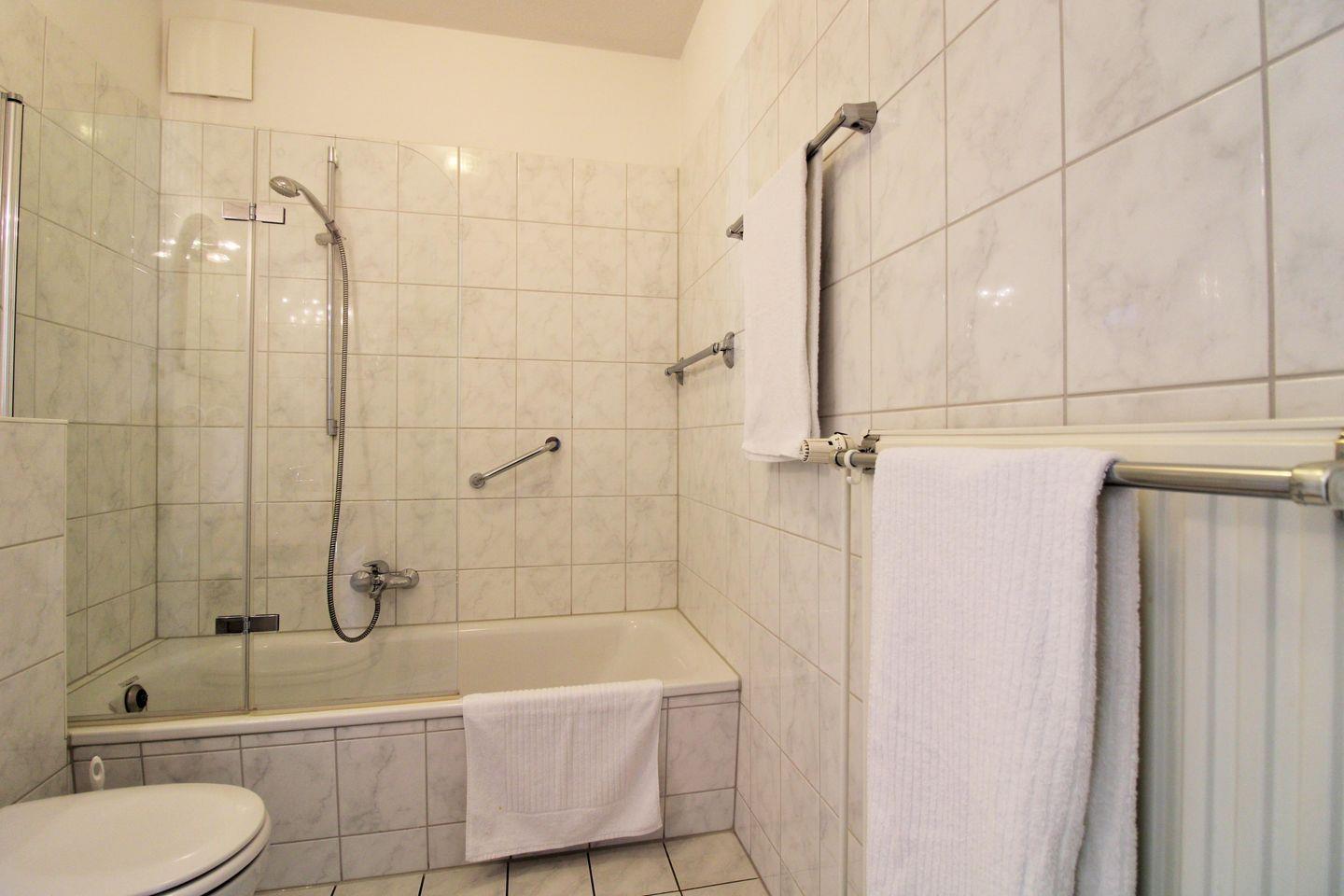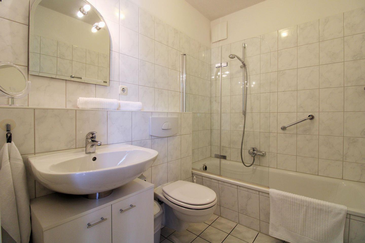Das Badezimmer verfügt über ein Wannenbad (mit Echtglas-Duschabtrennung), Waschbecken mit Unterschrank, WC sowie ausreichend Ablagemöglichkeiten.