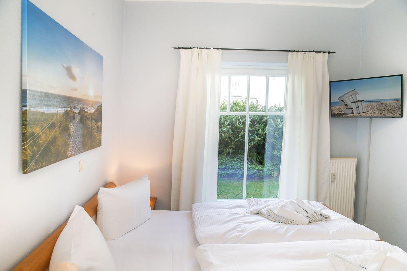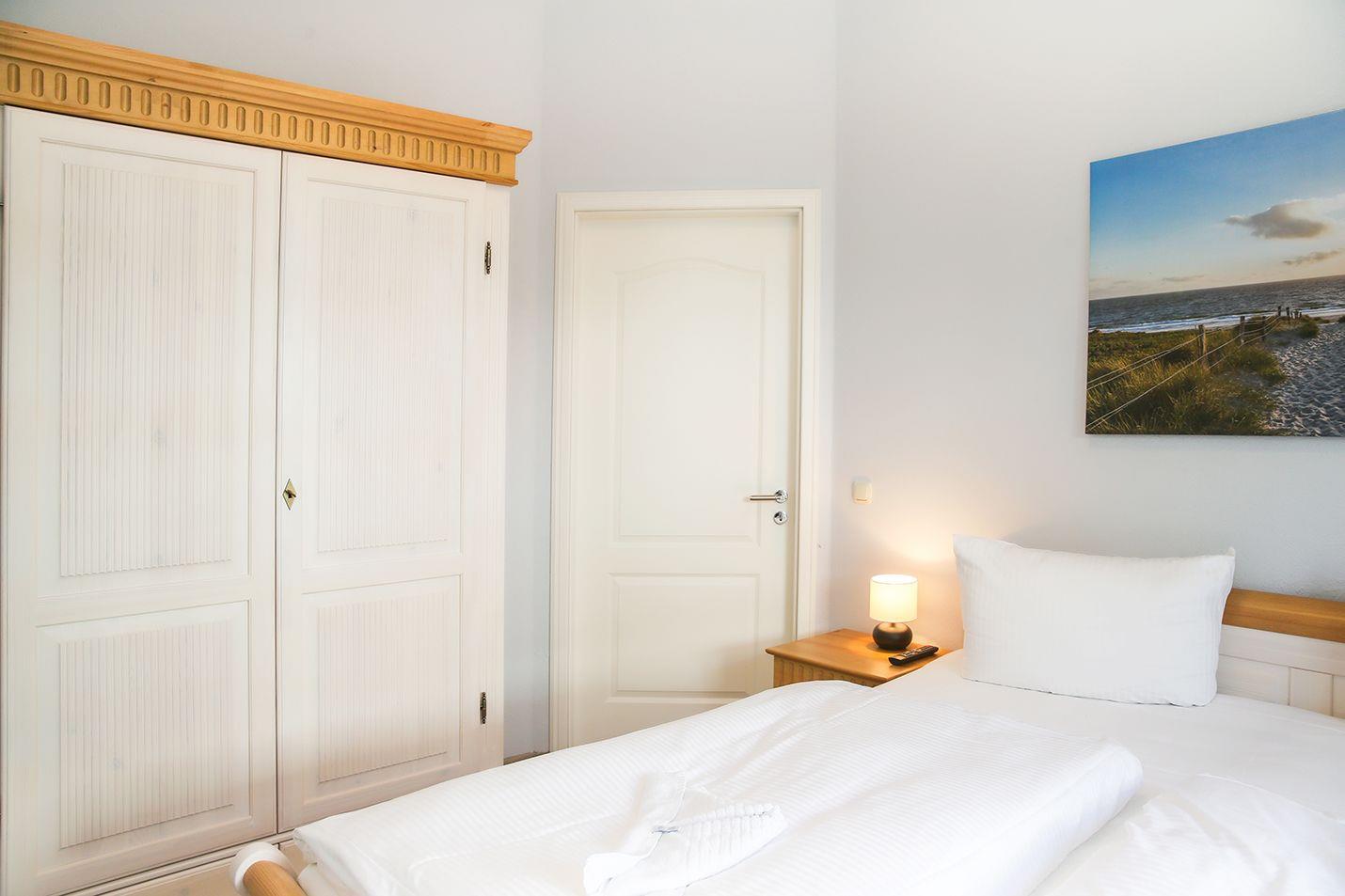Das helle und freundliche Schlafzimmer ist mit einem bequemen Doppelbett (180 cm x 200 cm), Nachttischen sowie einem geräumigen Kleiderschrank eingerichtet. Hier steht Ihnen weiterhin ein zusätzliches TV-Gerät zur Verfügung.