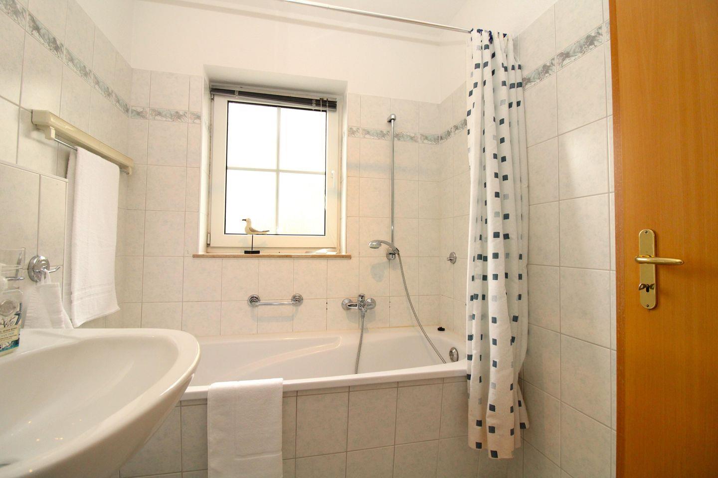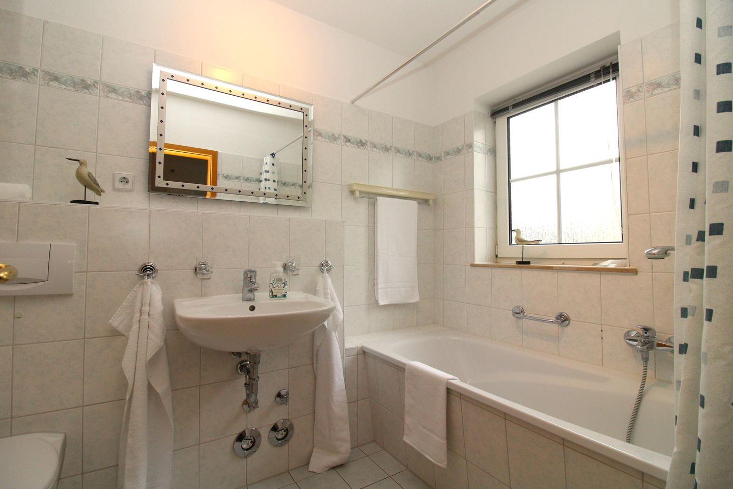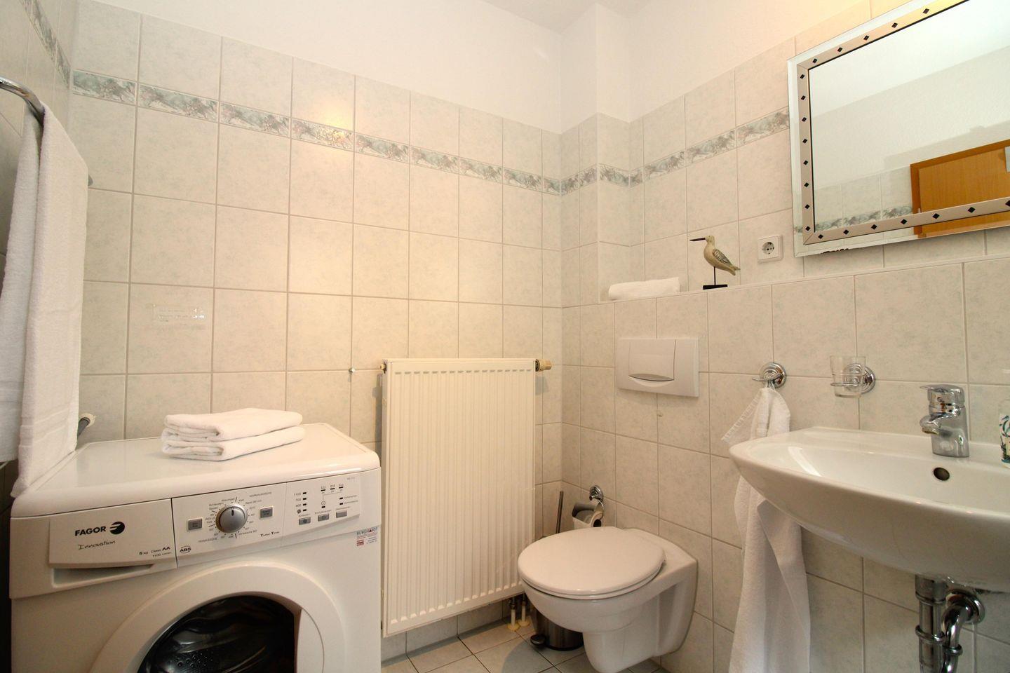 Das helle und geräumige Badezimmer (mit Tageslicht / Fenster) verfügt über eine Badewanne mit Dusche, Waschbecken und WC, eine eigene Waschmaschine sowie ausreichend Ablagemöglichkeiten.