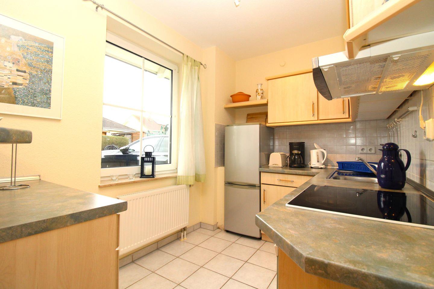 Die halb offene Küche beinhaltet eine voll ausgestattete Einbauküchenzeile mit 4-Platten-Ceran-Kochfeld, Backofen, Dunstabzug, Kühlschrank mit zusätzlichem Gefrierschrank, Kaffeemaschine, Wasserkocher und Toaster. Die Küche ist mit Geschirr, Gläsern, Besteck und Töpfen bestens und ausreichend ausgestattet.