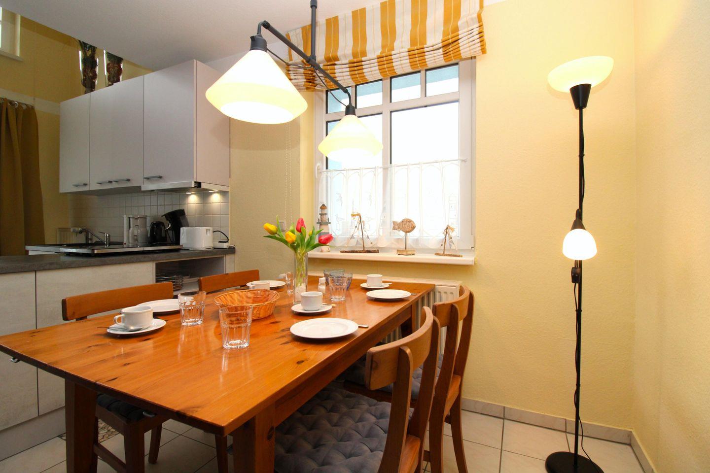 Die offene Küche beinhaltet eine voll ausgestattete Einbauküchenzeile mit 2-Zonen-Ceran-Kochfeld, Backofen, Dunstabzug, Kühlschrank mit Gefrierfach, Geschirrspülmaschine, Kaffeemaschine, Wasserkocher und Toaster. Die Küche ist mit Geschirr, Gläsern, Besteck und Töpfen komplett ausgestattet.